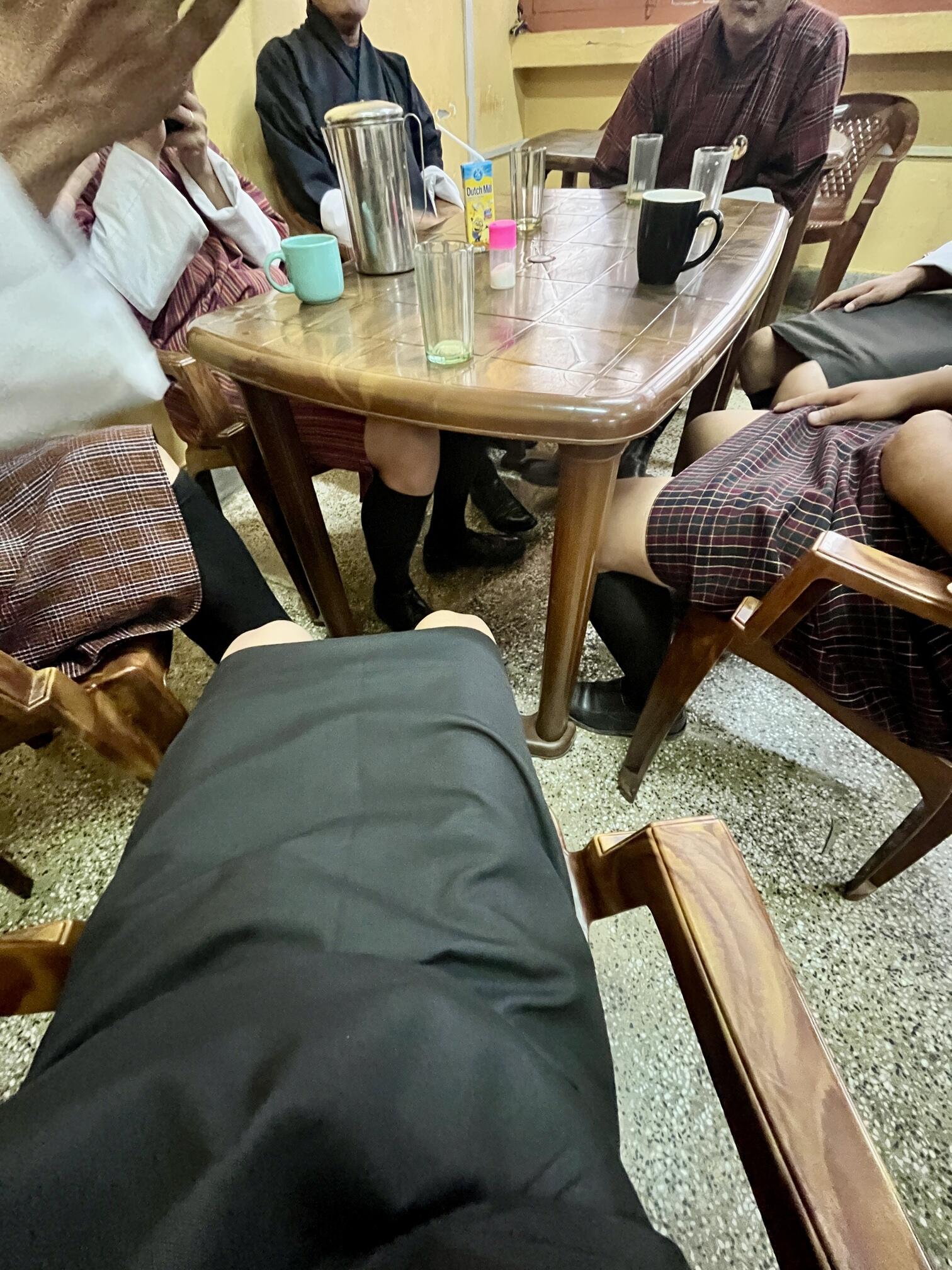 (↑ティータイムの様子、省庁勤務なので伝統衣装「ゴ」の着用が義務付けれています)