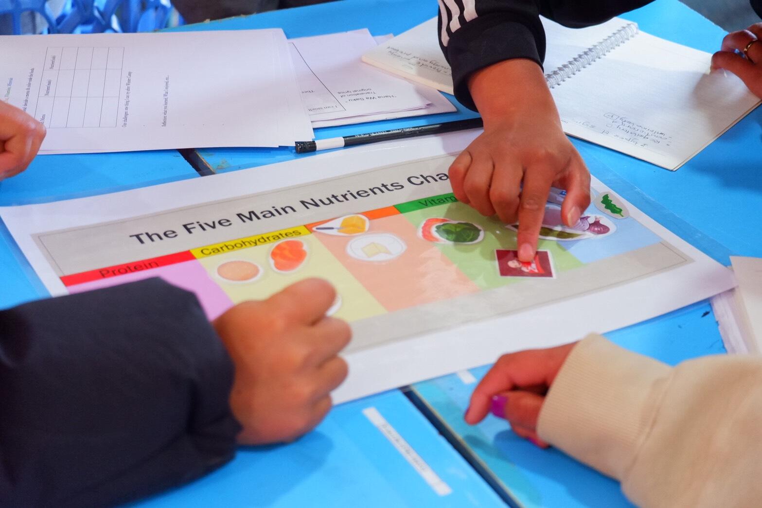前半は5大栄養素につ いて、後半はジュースに含まれる砂糖について学びました。前半では、食べ物カードを 栄養素ごとに分類し、バランスの良いメニュー作りに挑戦しました。後半では、実際に 角砂糖を用いて、砂糖の量を可視化する授業を行いました。