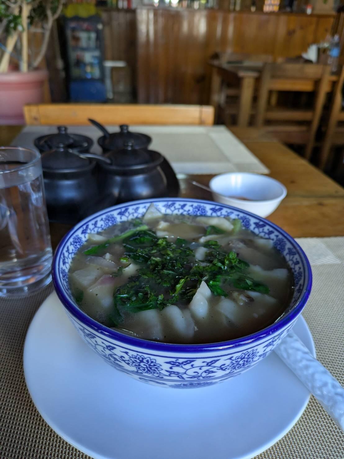 チベット料理が食べられます。おすすめは2つ目の写真のテントゥックという、ほうとうのような極太麺をぶつ切りにした麺料理です。ブータンでは珍しくコクと旨みを堪能できるスープに有り付けます。個人的にパロタウンで最も美味しい料理です。