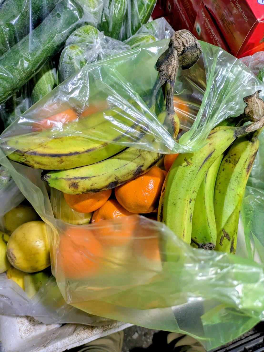 以下はパロの市場で果物を買った時の様子です。これはみかんとバナナを買ったのではなく、みかんを買ったらそれよりも多い量のバナナをサービスしてもらった時の写真です。![]()