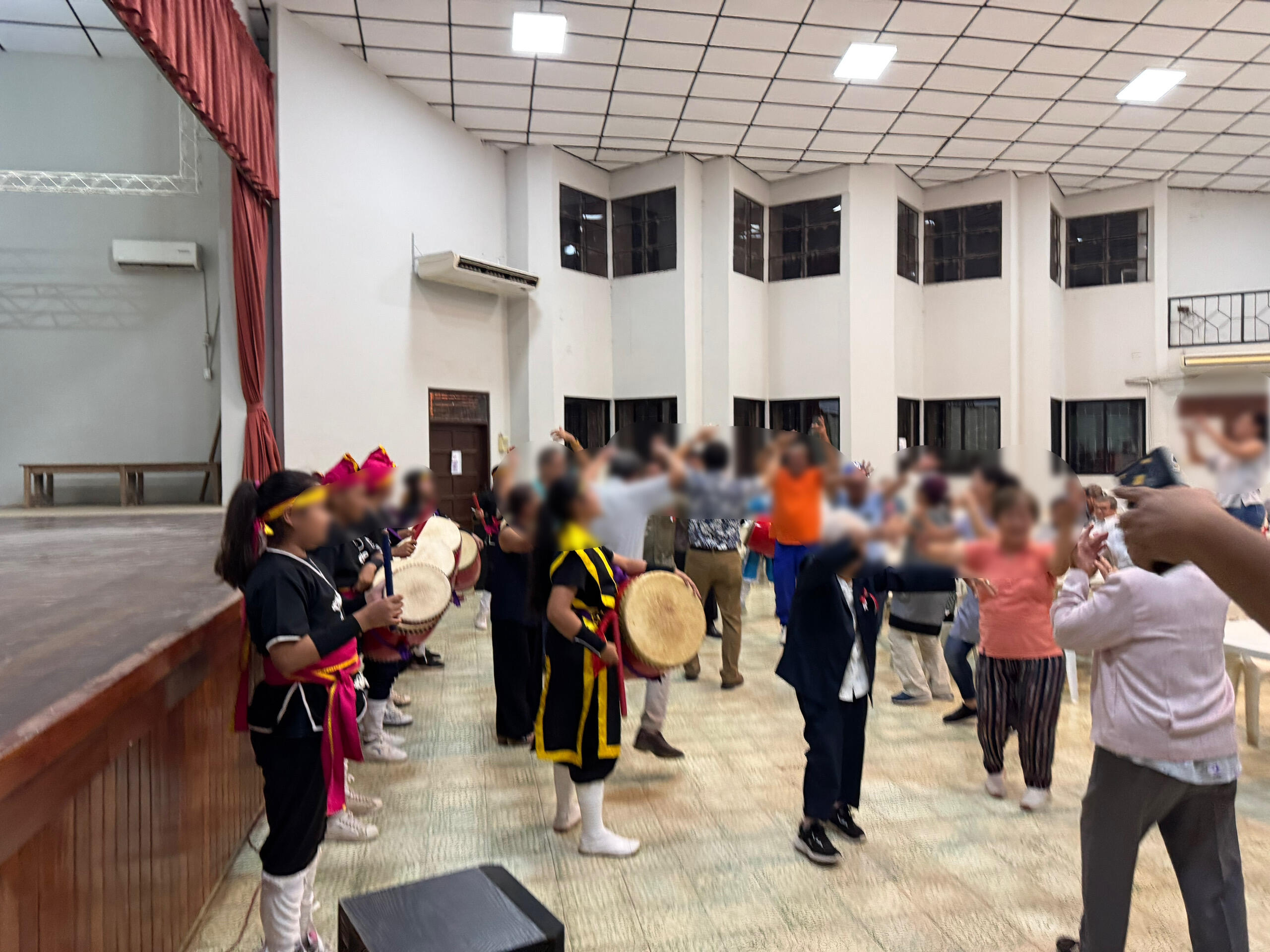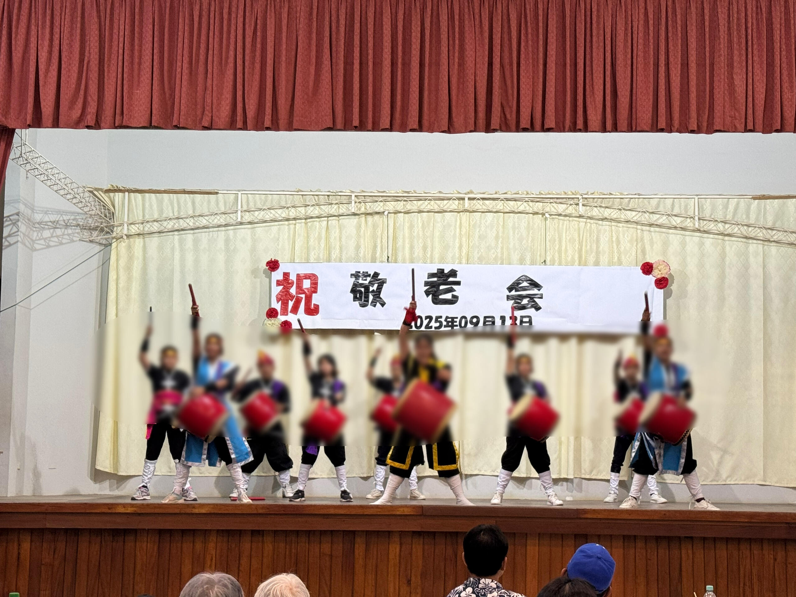 私の所属先であるヌエバエスペランサ校からは、出し物として子どもたちがエイサーを披露しました。太鼓の音が鳴り響くと、会場からは自然と手拍子が起こり、皆さん笑顔で見守っていました。敬老会の最後には会場全員のカチャーシーで締めくくり、遠くボリビアの地で、沖縄の伝統芸能が受け継がれ、地域の行事を彩っている光景に胸が熱くなりました。