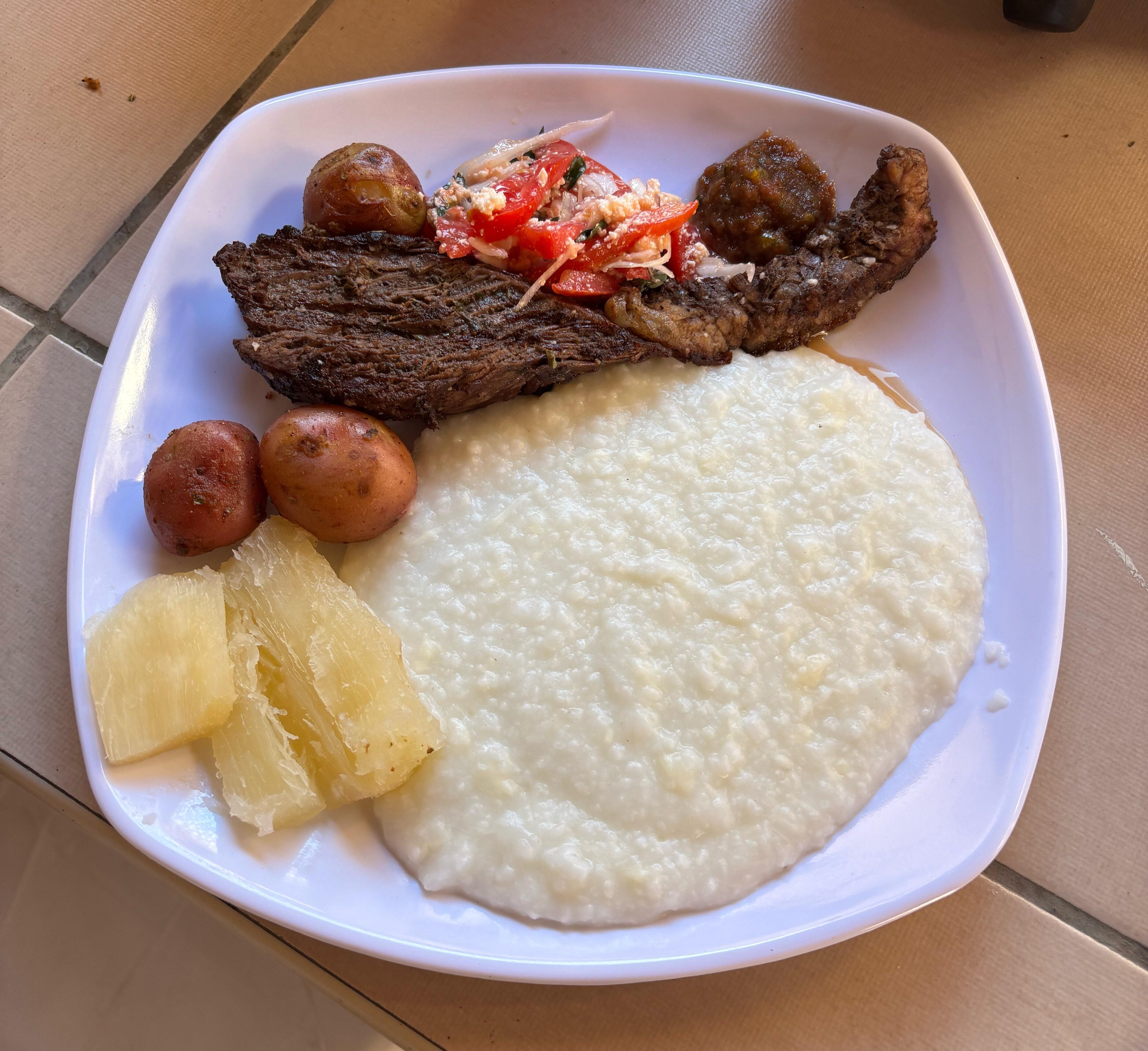 この日食べたのは牛肉、アロース・コン・ケソ(コメをチーズと牛乳で煮込んだもの)、トマトの漬物、ポテト2種類。その皿を食べ終えた後も次から次へとお肉が盛られていきました。コチャバンバは“食の街”としてボリビアで有名です。そこにいた1人が「コチャバンビーノ(コチャバンバ出身の人)は食べるために生きているのよ」と、みんな常に何かしら口に入れていました。そしてお酒を飲むときは次に飲む人を指名して「サルー(乾杯)」と言ってから飲むのがルール。お酒が強くない私ですがこの日はかなり飲んでしまいました。