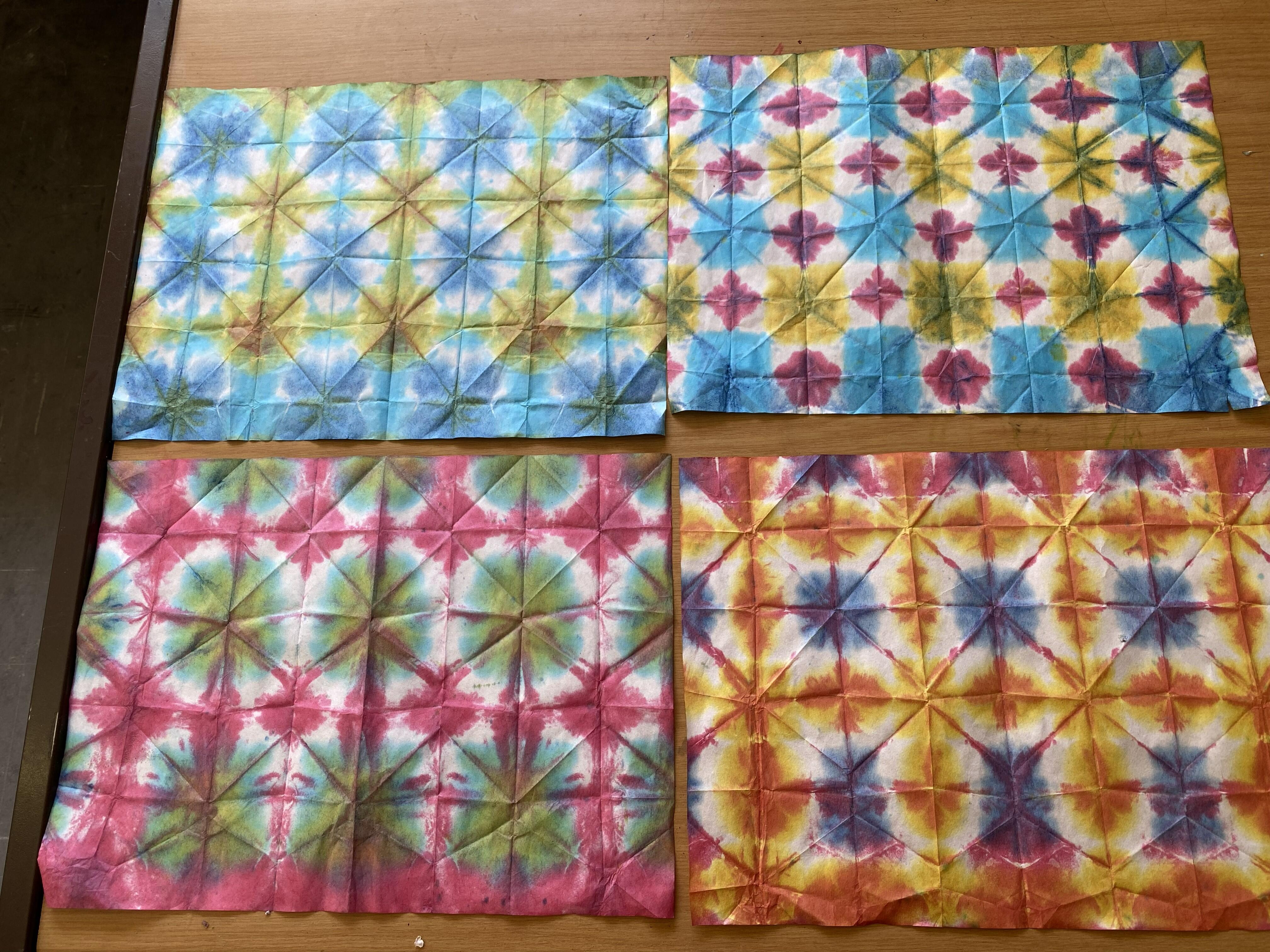 おり染めとは、和紙や障子紙をさまざまな形に折りたたみ、その角や辺を染料に浸して染める、日本の伝統的な染色技法です。開いたときに現れる模様や色合いを楽しむアートです。日本から少しだけ専用の和紙と染料をもって行きました。