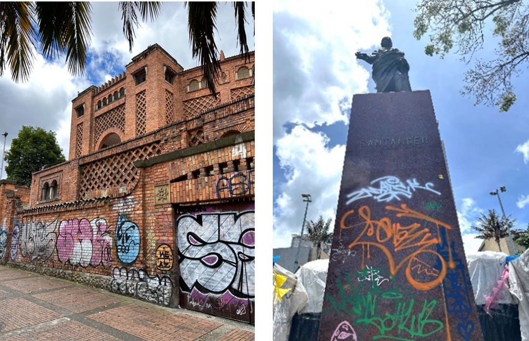 歴史のある旧闘牛場の外壁や、コロンビア独立の偉人、サンタンデール像の台座も汚されてこの有様です。せっかくの文化的財産も落書きで一瞬で価値を失うことになるような気がして残念に思います。