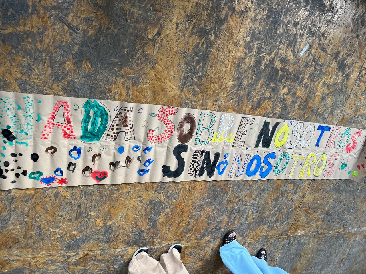 1枚目の写真は、実際に街中に出かけて公共交通機関の利用の仕方や権利について学ぶ4日間の「自立生活キャンプ」の参加者たちが協力して書いたバナーです。「NADA SOBRE NOSOTROS SIN NOSOTROS」=「私たちのことを私達抜きで決めないで」という障害者運動のスローガンが書かれています。この言葉は障害者権利条約の制定過程で、障害当事者が繰り返し訴え、世界中に広まりました。今でも世界中で大切にされています。