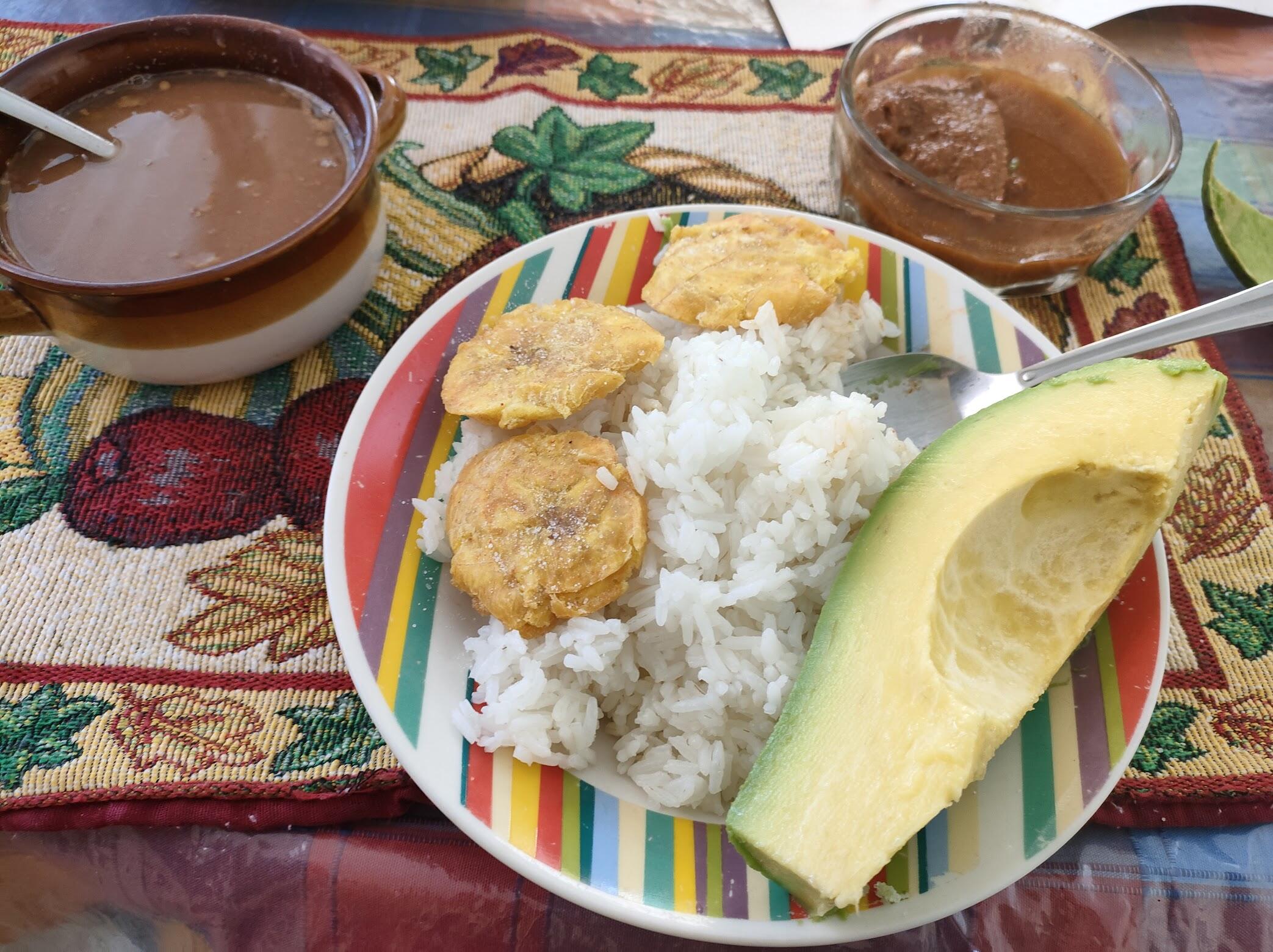 ドミニカ共和国の定番メニュー、アビチュエラ(豆のスープ)、ポジョギサード(鶏肉の煮込み)、トストーネス(揚げた調理用バナナ)、アボカド一切れ。もう飽きるほど食べているはずなのに、意外と飽きません。