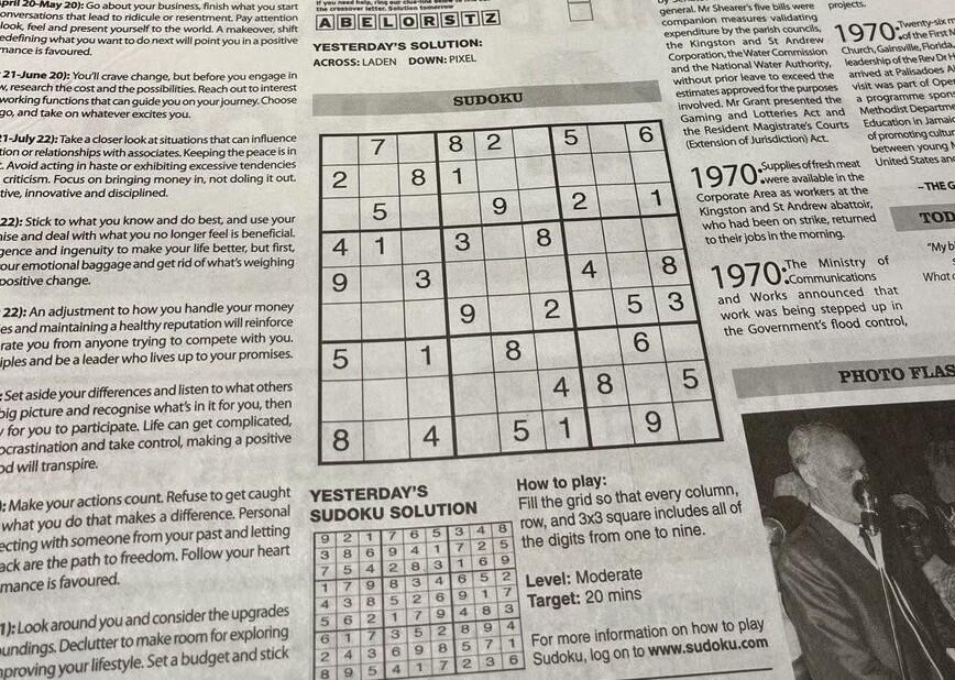 先日、ジャマイカの新聞の中に「SUDOKU(数独)」のページを見つけました。