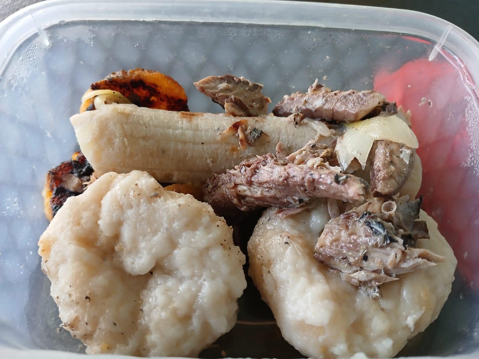 塩サバ、ゆでたお団子、バナナ二種類のこちらもジャマイカの定番の朝ご飯です。