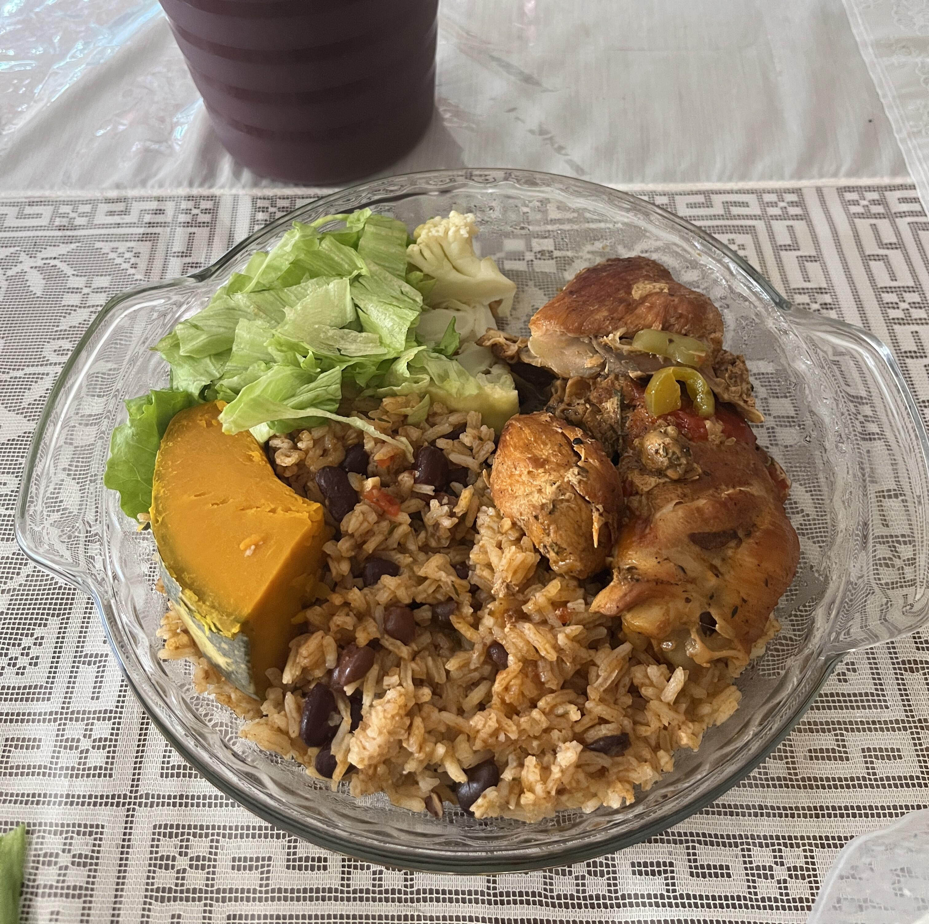 ジャマイカの定番料理の一つ、シチューチキンに、大家さんが育てた新鮮な野菜が添えられていました。とても美味しく、久しぶりに家庭の料理が体と心に染み渡りました。