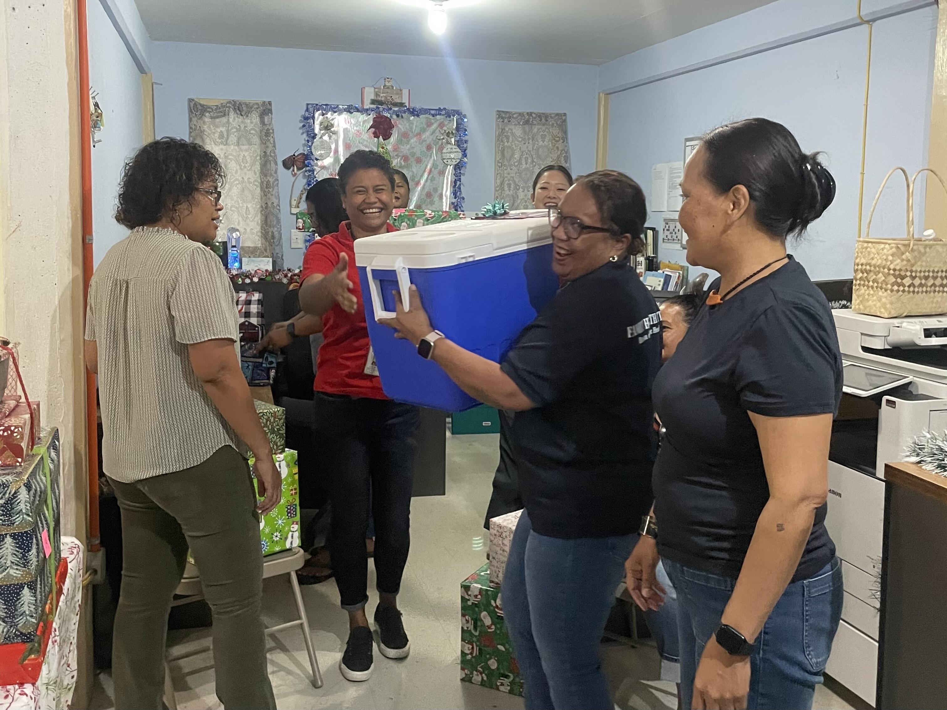 その分パラオのクリスマスは気合いが違います。12月に入った瞬間、町中がイルミネーションとクリスマスツリーだらけになり、同僚たちは仕事中にも関わらず家族や親戚、同僚へのプレゼントをゲットするべく奔走します。職場ではくじ引き形式でのプレゼント交換になり、一番歓声が上がったのはクーラーボックスでした!(魚釣りには必須なアイテム) 私も欲しかった〜!