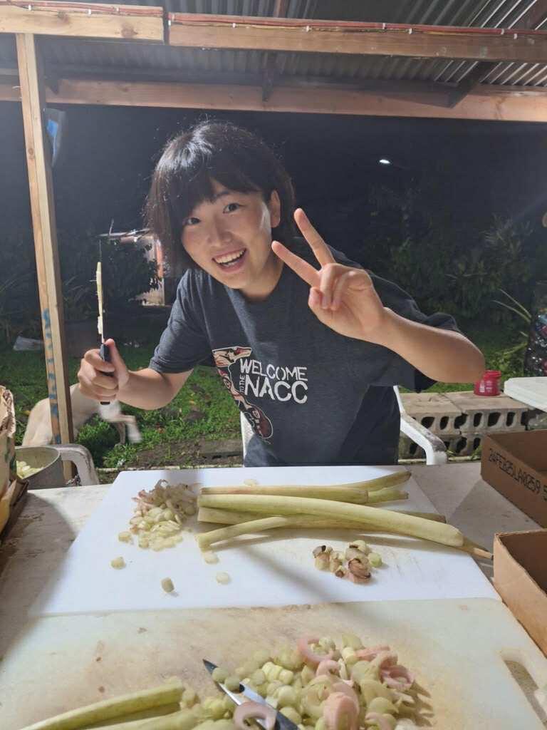 タロイモと呼ばれる芋の茎と葉を細かく刻み、煮込み、味をつけたら完成!私も作ってみましたが、ママと二人で切り続けること3時間強・・・。煮込み始めて2時間・・・。次の日まで寝かせて味付けをしてまた数時間・・・。とっても手間がかかります。ちなみにタロイモは、3つ収穫しただけで限界でした。そのくらいの力仕事です。