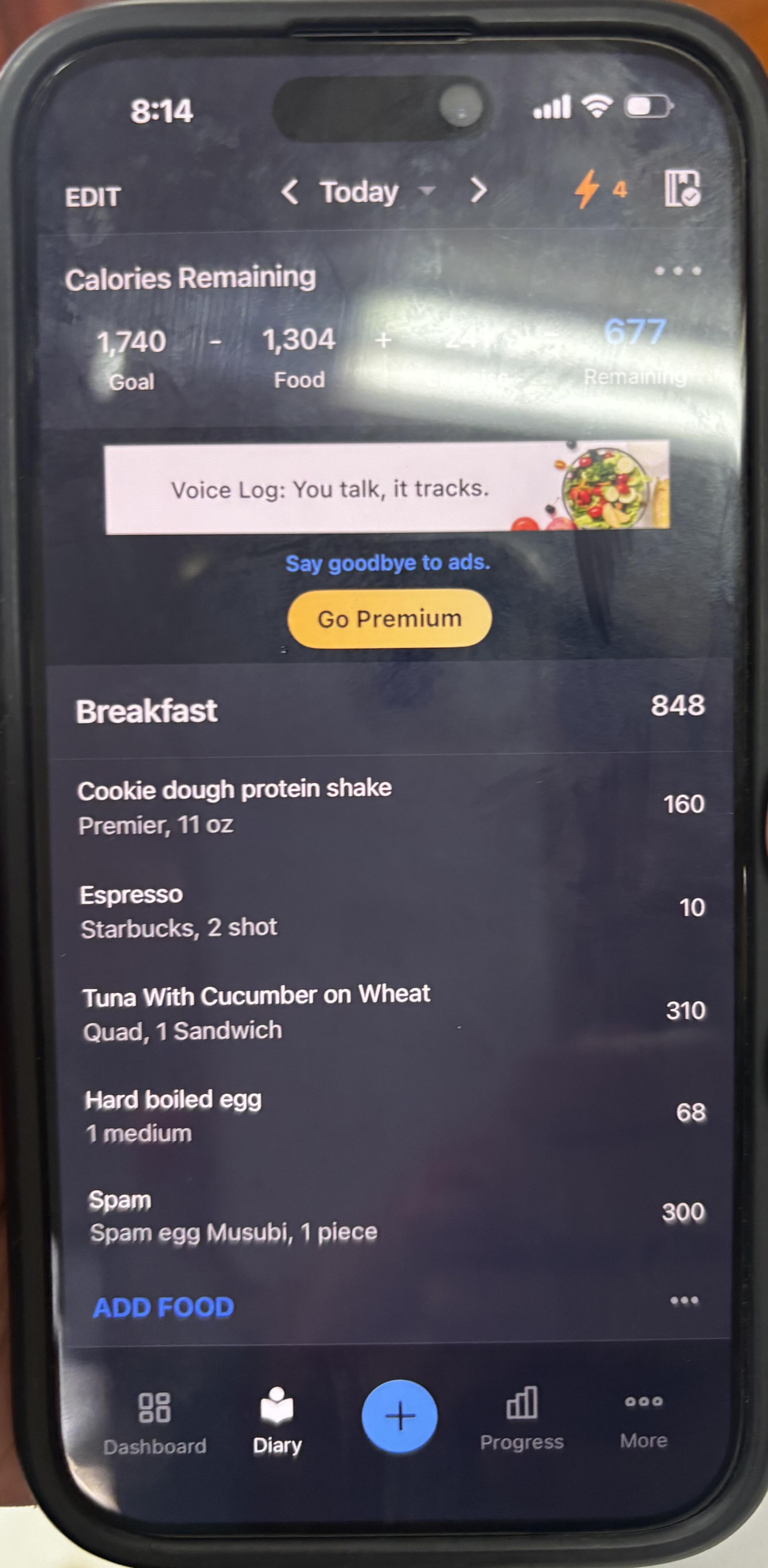毎朝500kcalは消費するトレーニングをしているため、朝食は十分な炭水化物と最低30gのタンパク質摂取を目標としているそうです。食事管理で使用しているアプリMyFitnessPal (上写真)を見せてもらうと卵、ツナ、スパムなどでしっかりとタンパク質を摂っていますね。