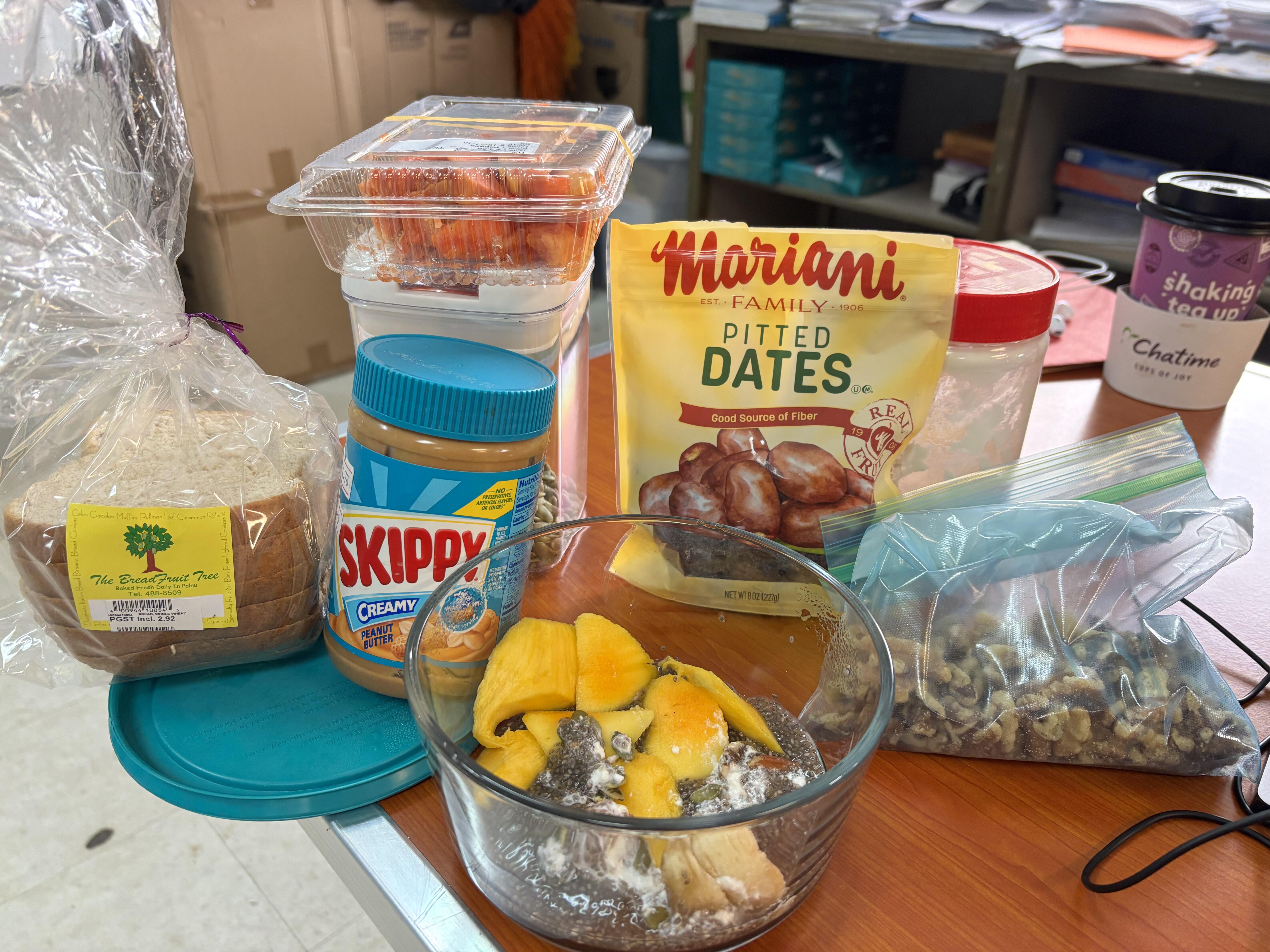 全粒粉パン、ピーナツバター、クルミなどのナッツ類、デーツ(ナツメヤシの実)、パパイヤ、オートミールやチアシード、手作りヨーグルトなどで、これがいつもの朝食だそうです。