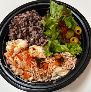 主食は玄米や黒米、主菜はミートローフ(左)やチキン(右)と付け合わせのサラダです。