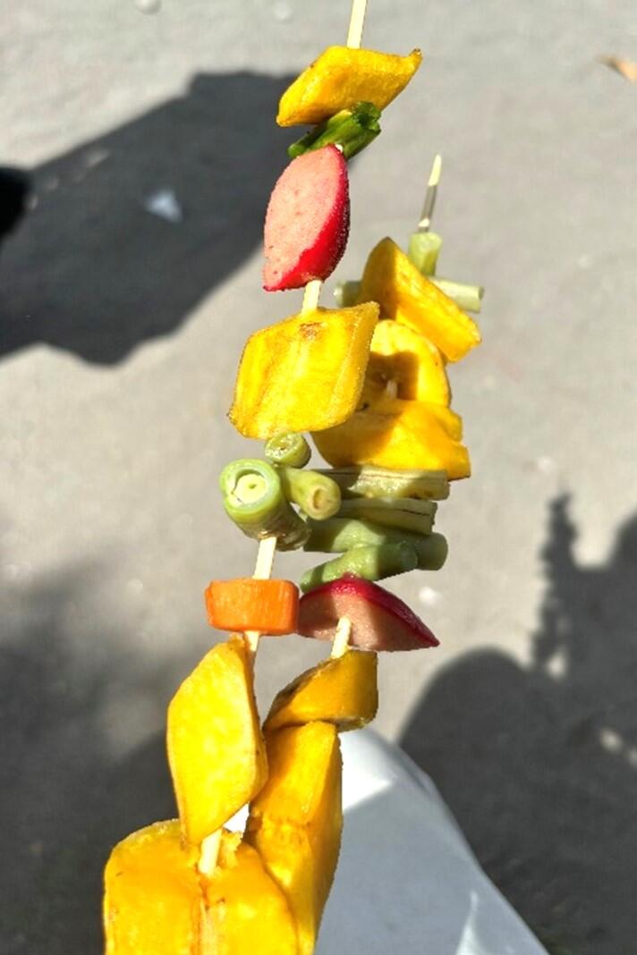 こちらはゆでられたカウカウと呼ばれる甘い芋、ウインナー、野菜等を串に刺して塩でまぶしたもの。