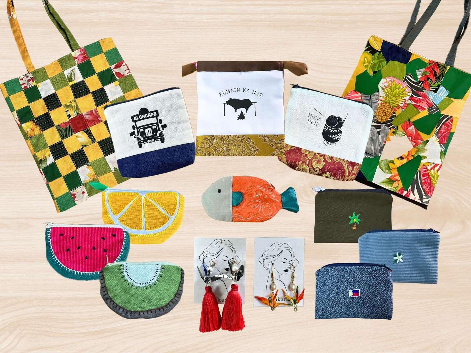 一番の売れ筋は、フィリピンらしいワンポイントを手作業でプリントしたポーチ(写真中央上)と、