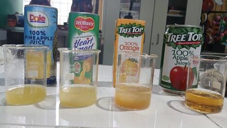 (写真中央の2つのみ、ジュースの上にエタノールの層が混ざらずに形成されている)。