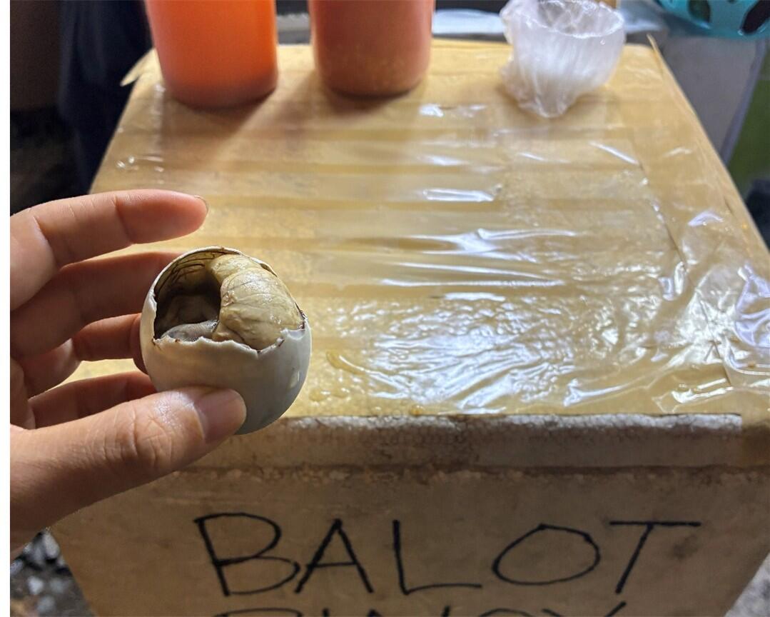 孵化直前のアヒルの卵で、セブではスパイシーソースや塩をつけて食べるのが一般的です。