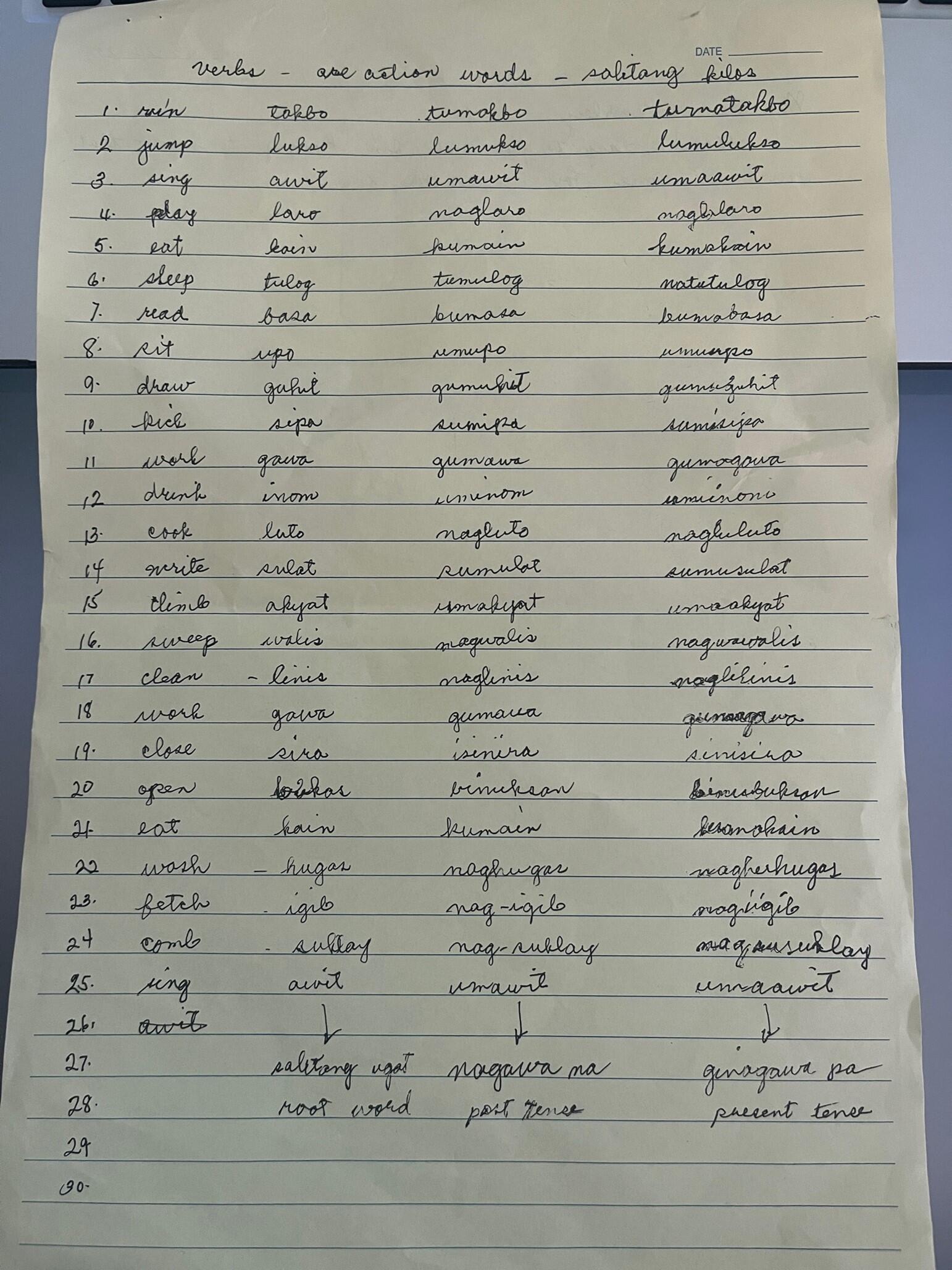 「キナライアは他では通じないから、タガログ語にしなさい」と、手書きのメモをたくさんくれたりもします。