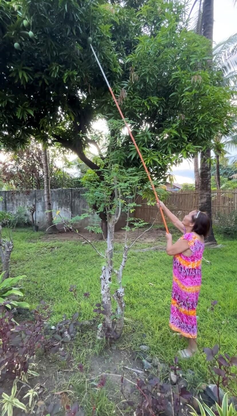 ある日、おばあちゃんが庭でマンゴーを収穫していたので一緒に採りました。