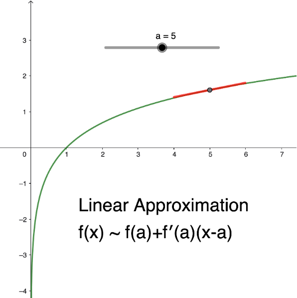 しかし逆に、目に見えない抽象的な概念の理解に関しては、苦手意識をもつセントルシアの学生が少なくないように思われます。例えば、「関数の1次近似」については、公式の「f(x) = f(a)+f’(a)(x-a)」を覚えて、具体的な1次近似式を求めることにはとても一生懸命です。しかし、この公式が「曲線を、直線で近似的に表す」ものであることを理解している学生は少ないのです。すなわち、公式の本質的な意味(抽象的な概念)を理解することなく、数学を学んでいるのです。「これでは、数学の本当の楽しさや面白さは伝わらない」と、私は思い悩みました。そして、思案の末に、彼らの抽象概念の理解を助けるビジュアル教材の開発を志すことにしたのです。先ほどの、「関数の1次近似」に関しては、Geogebraというアプリを使って次のようなモデル教材を作りました。