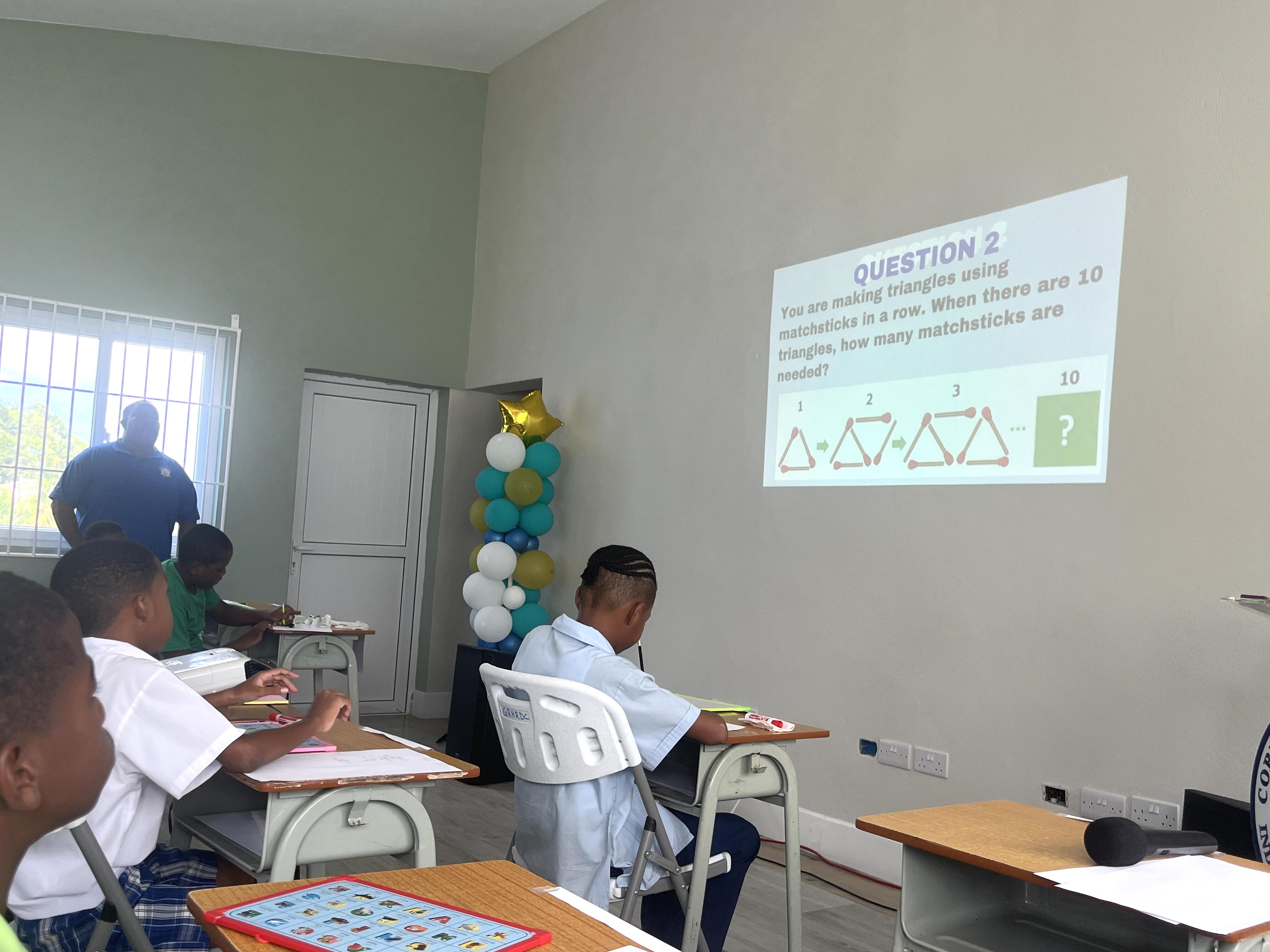 今回は先日行われた算数、数学クイズ大会について紹介します。セントルシアの学校では11月を算数、数学月間として設定しています。それに伴って毎年クイズ大会をしているのです。各学校から代表生徒を選出し、会場に集まります。午前中は小学5年生、午後は中学3年生に向けて計画されています。各自治区で1位の生徒を決め、半年後8つの自治区の優勝者が集まりさらにクイズ大会を行い、セントルシアで1番を決めます。生徒たちは1位を目指し、さらに上位に贈られる賞品も狙いに算数数学の勉強をやりこんでくるのです。約20問の問題をそれぞれ45秒ずつ、答えは用意されたホワイトボードに書いて時間が来たら一斉にチェックします。回答者は緊張した面持ちでクイズに臨んでいました。