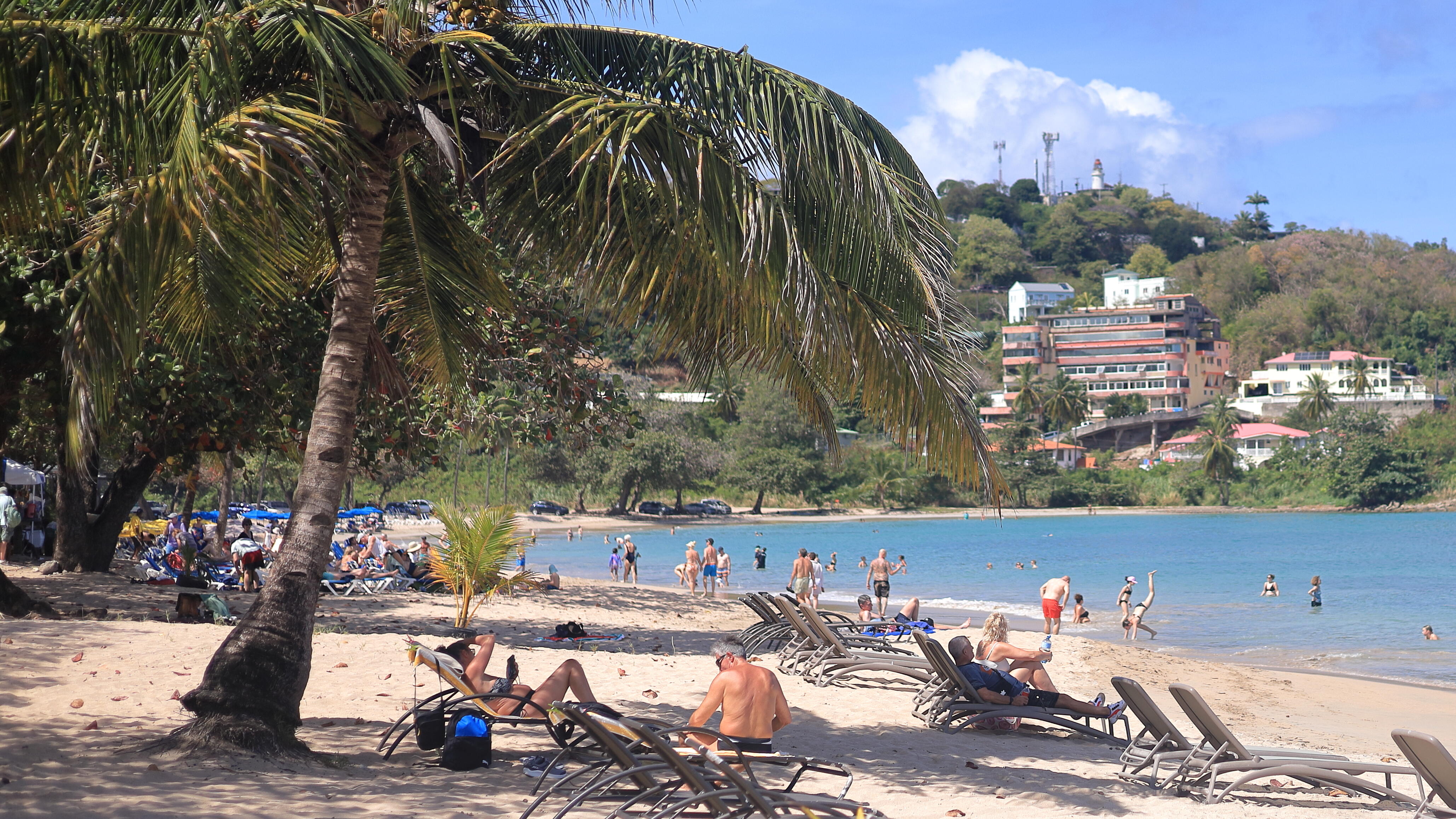 今は乾季2月だ。クルーズ客がチャーターバスでVigie Beachにやってくる。白人比率90%以上だな。