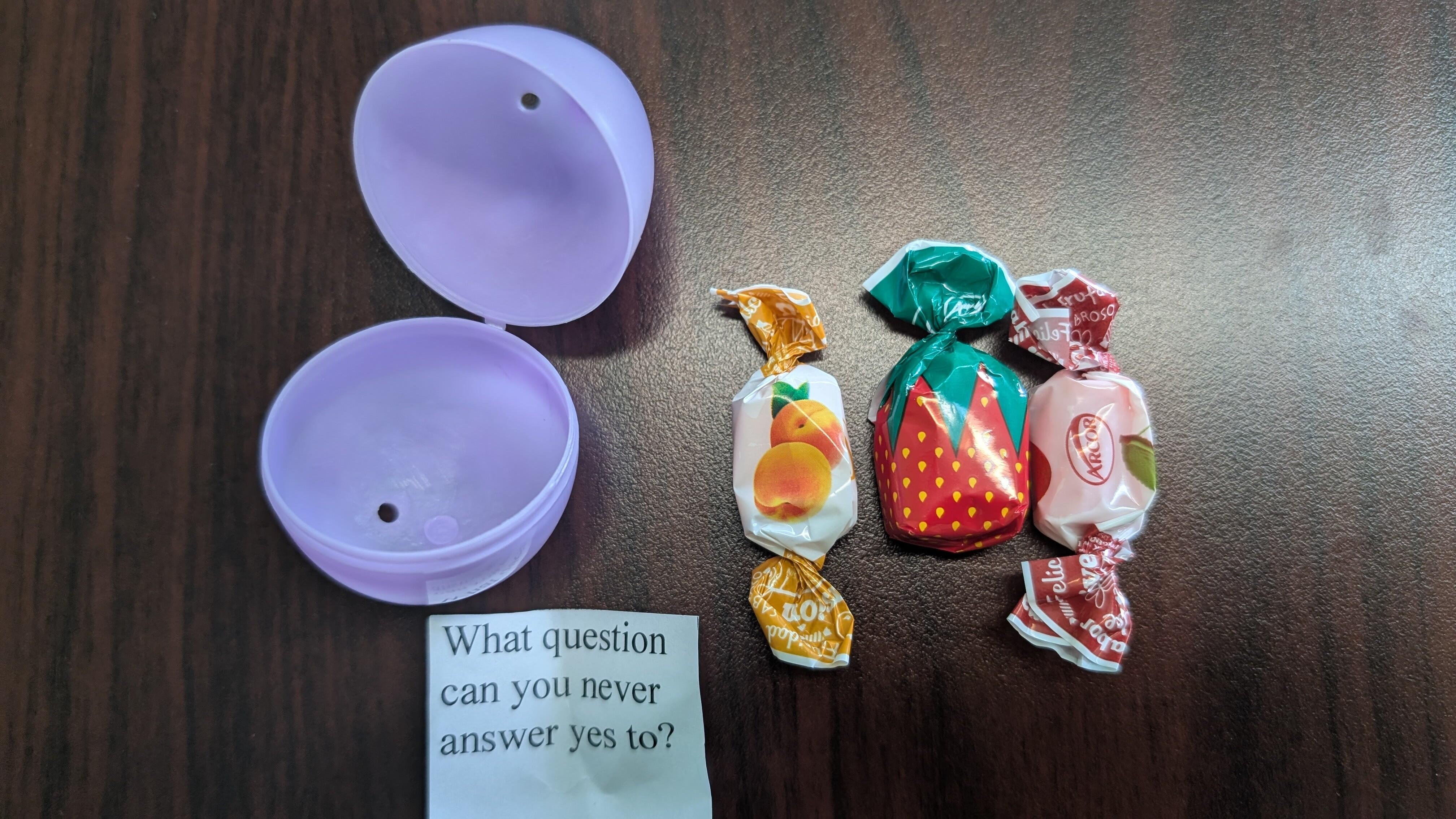 プラスチックの殻を割るとキャンディーとなぞなぞが入っている。