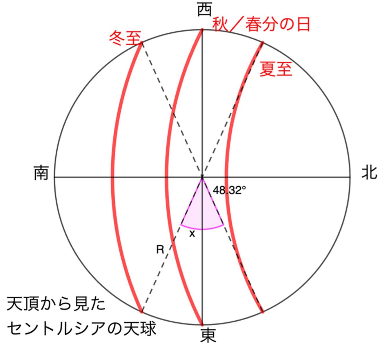 この方程式を、関数電卓を使って解くと、x≒24.16°を得ることができます。(お疲れさまでした。)すなわち、冬至の日の出は、秋分の日の日の出の位置(真東)から24.16°だけ南側にずれていることになります。従って、夏至と冬至の日の出の位置を比べると、2倍の48.32°ずれていることになるのです。2つ目のモデル図は、天頂から見下ろした(上から見た)セントルシアの天球になります。先ほど議論した「夏至と冬至の日の出の位置が、48.32°ずれている」ことを示しています。また、夏至、秋分の日(春分の日)、冬至の太陽の通り道を赤色で示しています。横から見た1つ目のモデル図に対して、今回は上から見ていることになります。