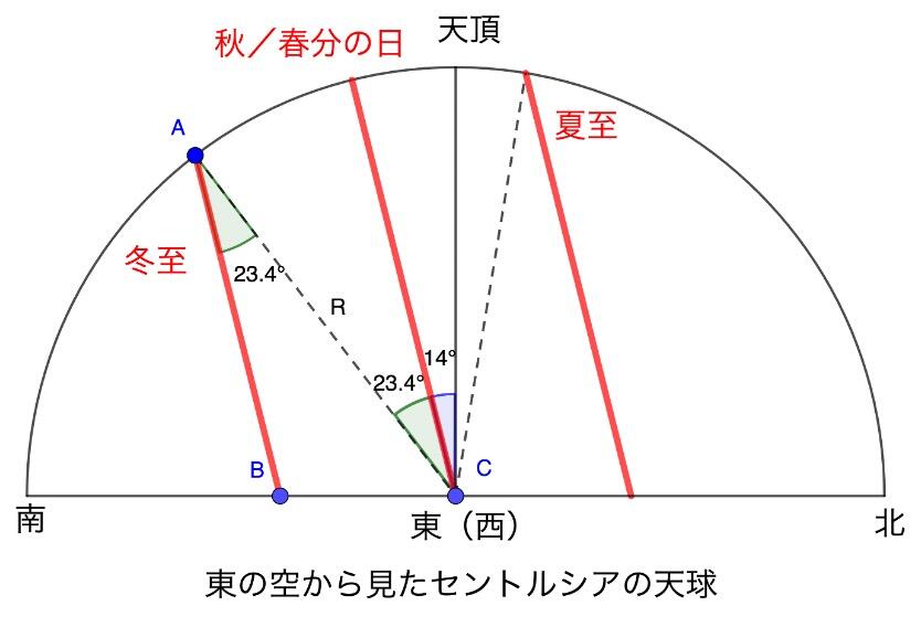 さて、冬至の日の出が、真東からx°だけ南側にずれているとすると、BC=Rsin x°だから、