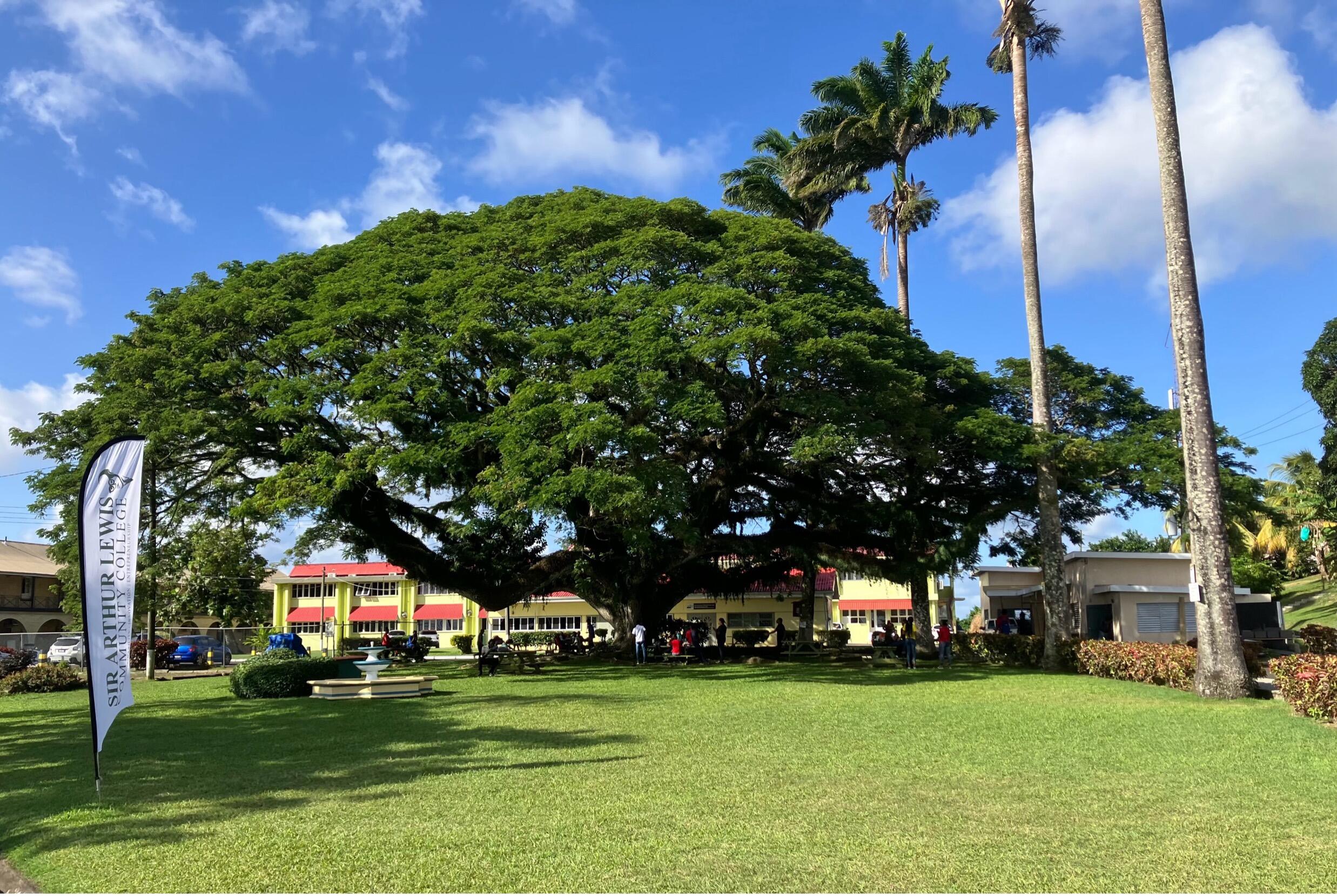 配属先のキャンパスでは、大きな「レイン・ツリー」が象徴的な存在になっています。日本では、グループ企業のコマーシャルに使われましたので、「この木なんの木」として馴染みのある方も多いことでしょう。日の出とともに葉を開き、午後には葉を閉じる就眠運動をするのですが、雨が降っても葉を閉じることから、「レイン・ツリー」の名前がついているそうです。学生や教員にとって、大好きな憩いの場を提供してくれる大木なのですが、実はマメ科です。「セントルシアには、マメ科の大木が多いのではないか」と気づいた私は、早速ミニ探究に取り掛かることにしました。すると、とても興味深い因果関係を見つけることができたのです。セントルシアは、火山地質である上、降水量が多く、植物の生育に必要な窒素が土壌から流れ出してしまう可能性があります。ところが、根粒菌という役者が、マメ科植物の根を宿主として共生しているのです。この根粒菌が、窒素分子をアンモニアに固定して、植物細胞に供給しているので、マメ科は窒素不足にならないのです。そして、生命が繁茂する熱帯では、生存競争が激しく、高く大きく成長しなければ、日光の恩恵を受けることができなかったという訳です。「セントルシアには、マメ科の大木が多いのではないか」という気づきに端を発して、たくさんの学びを得ることができました。やはり「知るは楽しみなり」ですね。