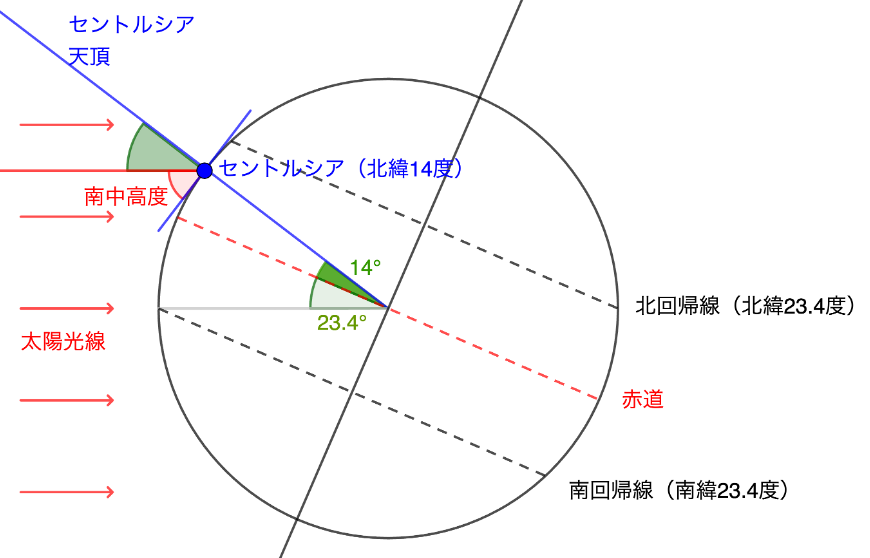 さて、最後にセントルシアの冬至(今年は12月21日)について、お話をしておきましょう。セントルシアは北緯14度に位置しますので、地軸の傾きを23.4度とすると、この日の太陽の南中高度は、90度―(14度+23.4度)=52.6度となります。これは、新潟県長岡市(北緯37.4度)の秋分の日(春分の日)の太陽の南中高度に相当します。日本には「暑さ(寒さ)も彼岸まで」という表現がありますが、セントルシアの太陽は、言わば、秋のお彼岸の地点で折り返して、再び高く、すなわち再び暑くなり始めるのです。どうりで一年中暑いはずですよね。そして、国民の皆さんは、この日を境に闇が再び光をとりもどすことを共に喜び、国名Saint Lucia、守護聖人ルチア、そして自由と独立を勝ち取った歴史への誇りを、共に分かちあうのです。