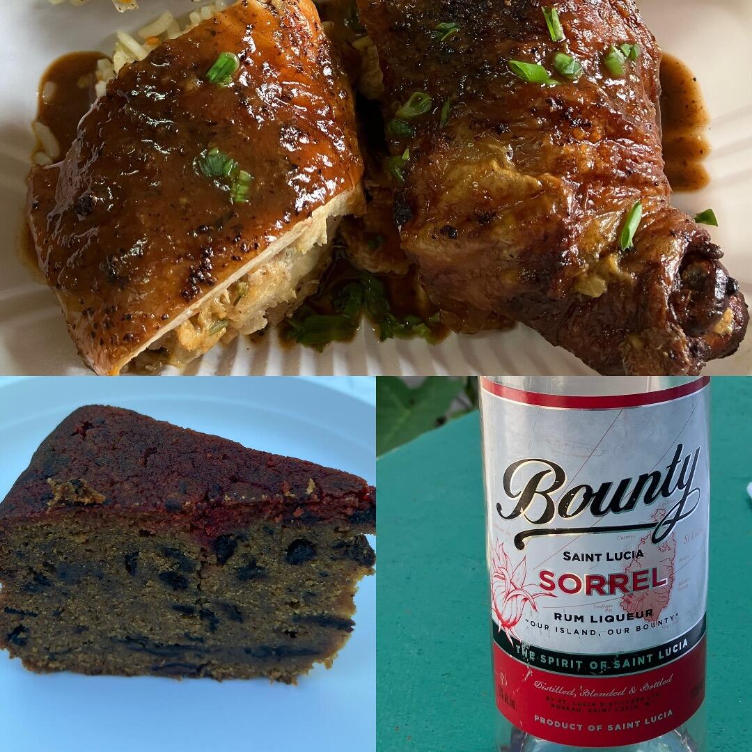 伝統的なクリスマス料理を味わう機会にも恵まれました。まずは、Stuffed Chicken。七面鳥は高価ですので、鶏肉にパンや香味野菜やハーブなどを詰めてローストしたものを、配属先カレッジのレストラン・メニューとして、料理専攻の学生達が振る舞ってくれました。そして、クリスマス・フルーツケーキ。私はローカルの知人から頂いたのですが、レーズンやチェリーやオレンジピールなどのフルーツを、その方は、なんと1年間ラム酒に漬け込んで熟成させた、と言っておられました。アーモンドやクルミなどのナッツ、ナツメグやシナモンなどのスパイス、そして黒砂糖も相まって、とても重厚感のあるケーキに仕上がっていました。かつてカリブの植民地経済を支えたサトウキビから作られる砂糖とラム酒。いわゆる過去の記憶が詰め込まれた伝統菓子でもあるのです。長期保存可能と言いますから、物理的な重みだけでなく、時間軸上でもその存在感をアピールしているかのようです。最後に、ローカルジュースSorrel。ハイビスカスのガクを乾燥させたものを使った飲み物です。紅色で少し酸味があります。私は、ラム酒を入れたものを頂きました。フルーツケーキと共に、クリスマスをお祝いするために各家庭で作り、味わうと言いますから、家族の味として受け継がれているのかもしれませんね。家族を離れて、まもなく1年が経過しようとする私にとっては、あまりにも羨まし過ぎる話です。
