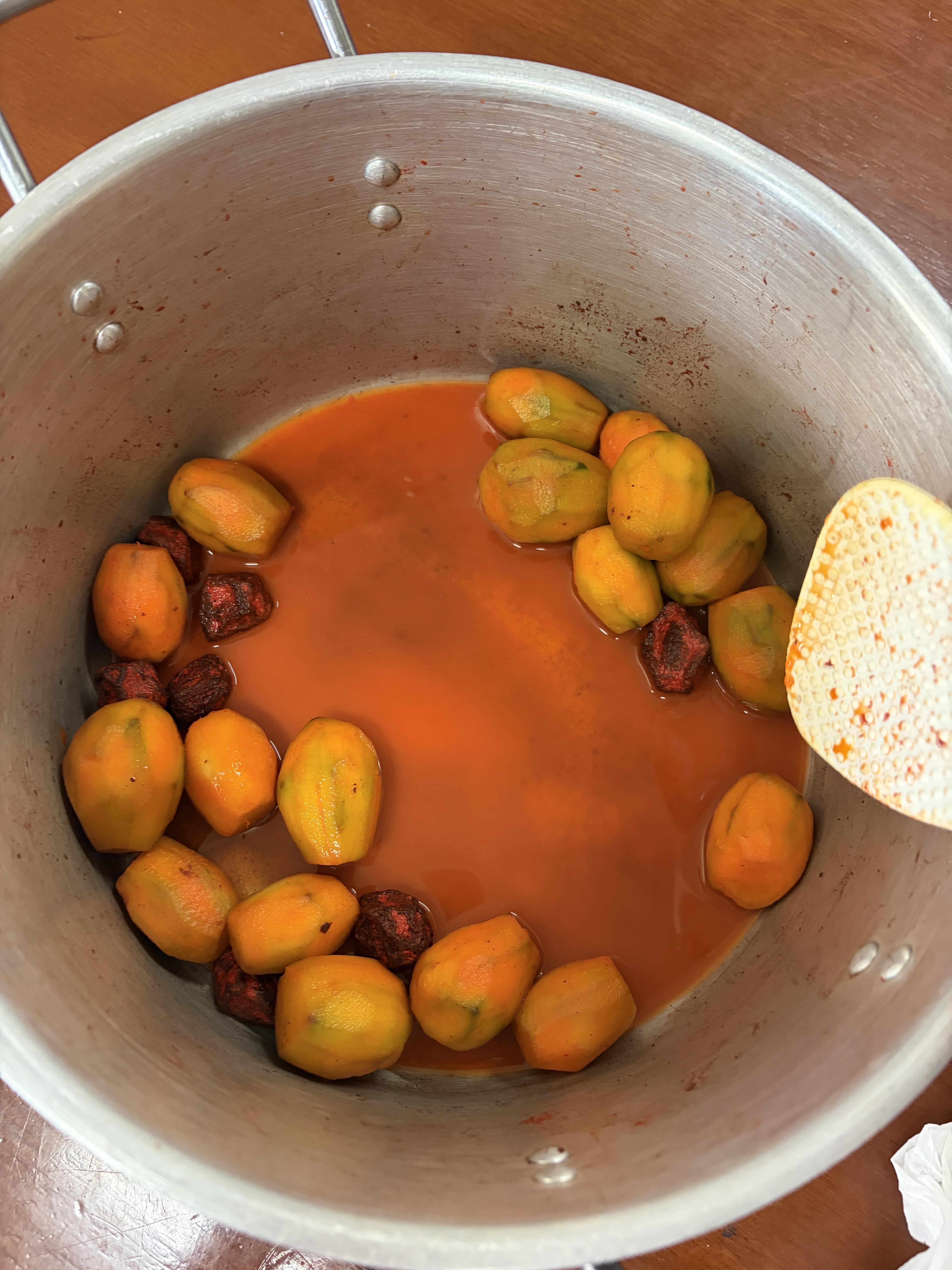 まだ熟していないViの皮をむいて、赤い粉(酸味のある味)で味付けをして食べていました。一口食べてみると青臭い味とパウダーの酸味のある味でした。正直これで正解なのかな??と思いながら食べましたがマーケットでの謎が解けて嬉しかったです。