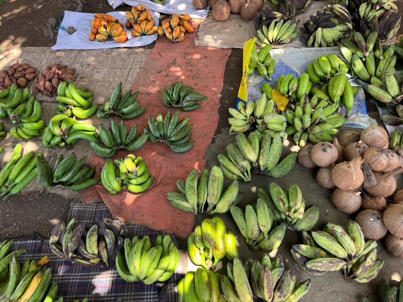 (写真② マーケットで売られているバナナ。左奥に置かれているのがFUKI TORAKAと呼ばれるバナナです!)
