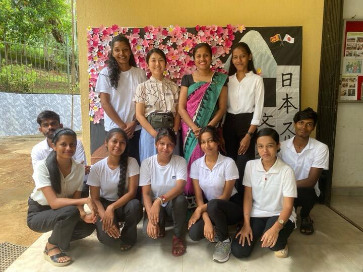 スリランカには、イベントやプログラムが始まる前にゲストを出迎える文化がある。この日は日本の衣装である浴衣とスリランカの民族衣装サリーを着た学生たちとともに、センターの玄関ホールでゲストをお出迎え。