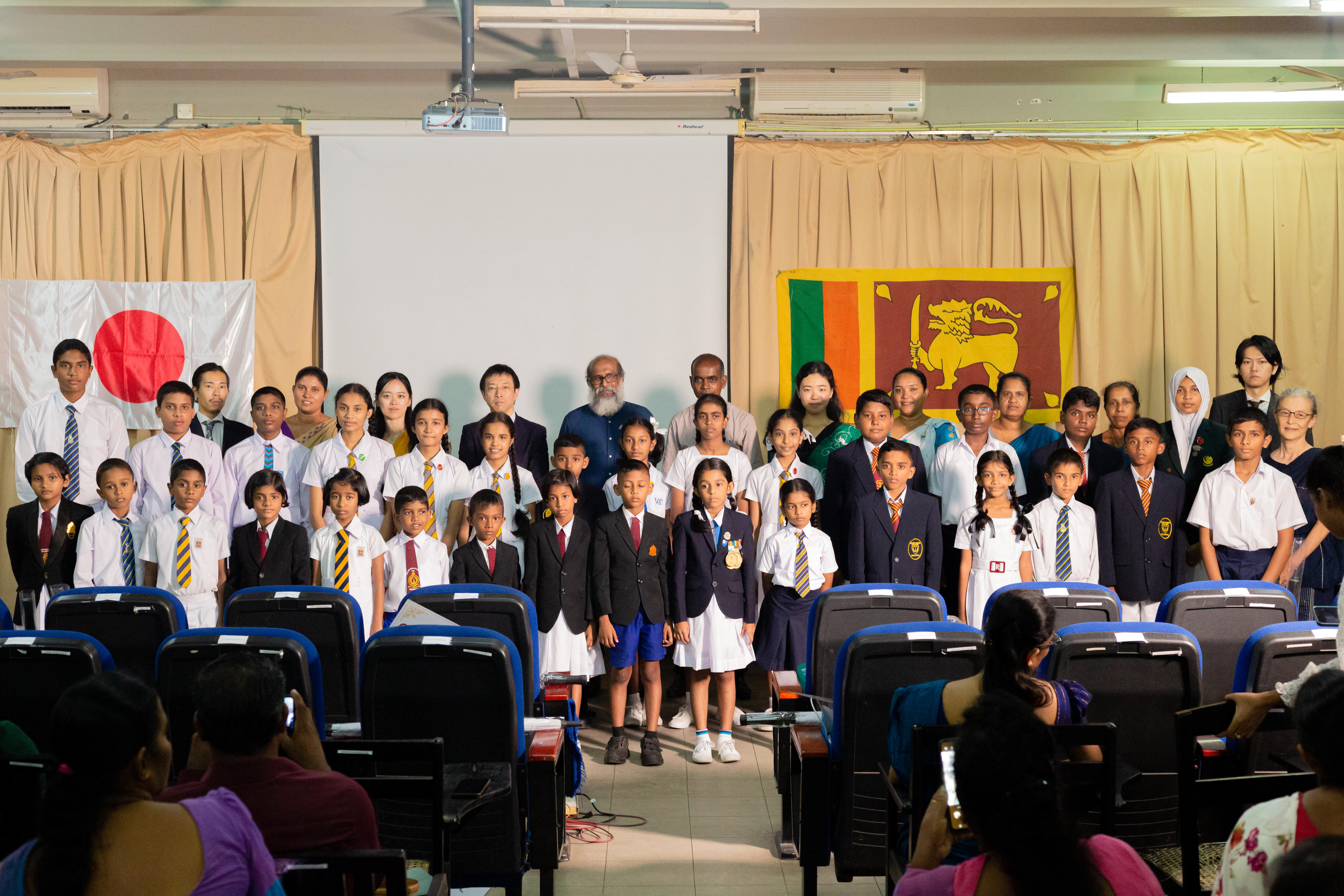 当日は高学年の部・低学年の部それぞれの1~3位とスペシャルアワードの受賞者30名を招待し、ビンギリヤ、クリヤピティヤ、キャンディ、クンダサーレ各町から児童30名とその保護者・先生約45名、ゲスト10名が参加しました。