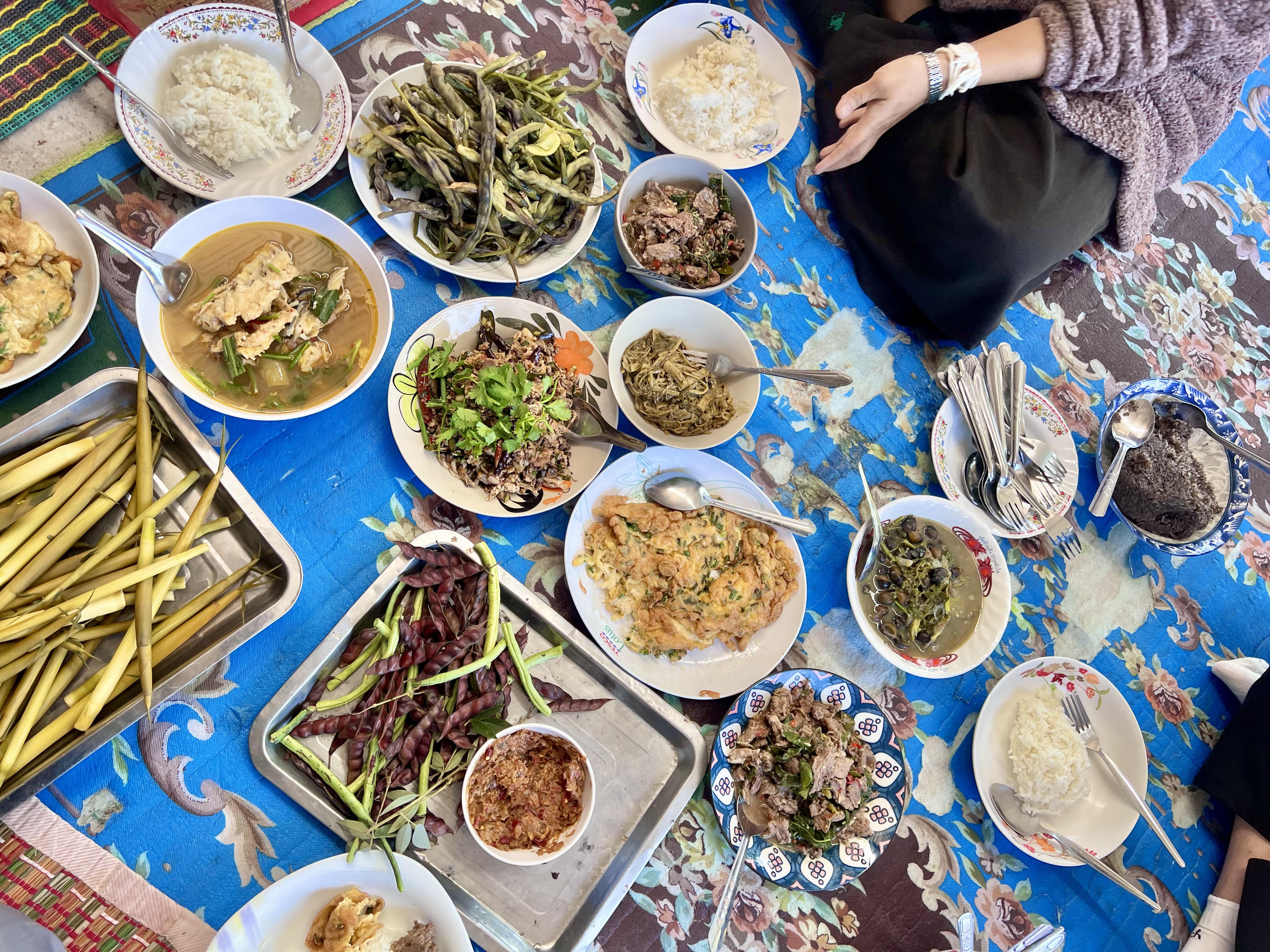 活動の中で、担当コミュニティを中心に様々なコミュニティに足を運ぶ機会は度々あり、時には外泊を伴うこともあるため、ホームステイをさせてもらったり住民の皆さんが作ってくださるお料理を食べるなど、ローカルな文化に触れる機会にも恵まれています。(写真はプークラドゥンのコミュニティを訪問した際の朝ごはんです。筍や山菜を使った料理がたくさん!)