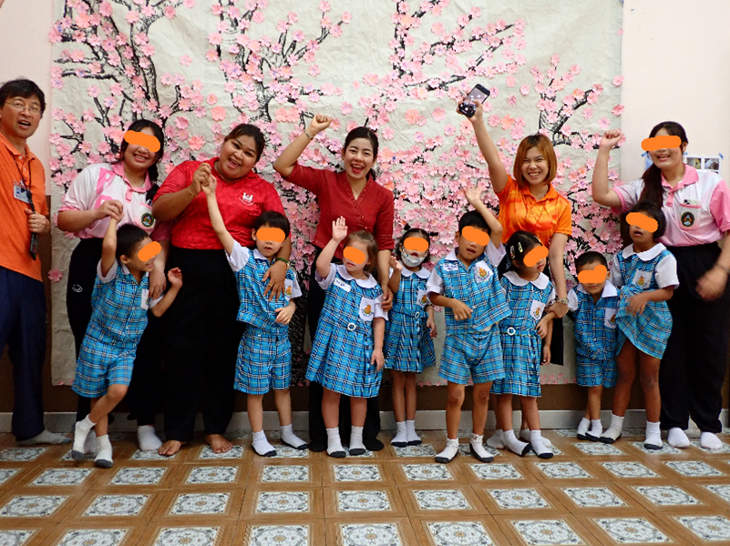 これまで、簡単な日本語のあいさつのことばから始まり、今は主に日本の手遊び歌を紹介しています。「時計の歌」からはじめ、「トントントントンひげじいさん」「ふるさと」「小さな世界」などこれまでで13曲にレパートリーは増えています。みんな日本語はわからなくても、見よう見まねで楽しく踊ったり歌ったりしています。子どもたちはとにかく元気で、しかしそれに勝るとも劣らないスタッフたちの明るく楽しそうな様子、まさに「微笑みの国」タイです。