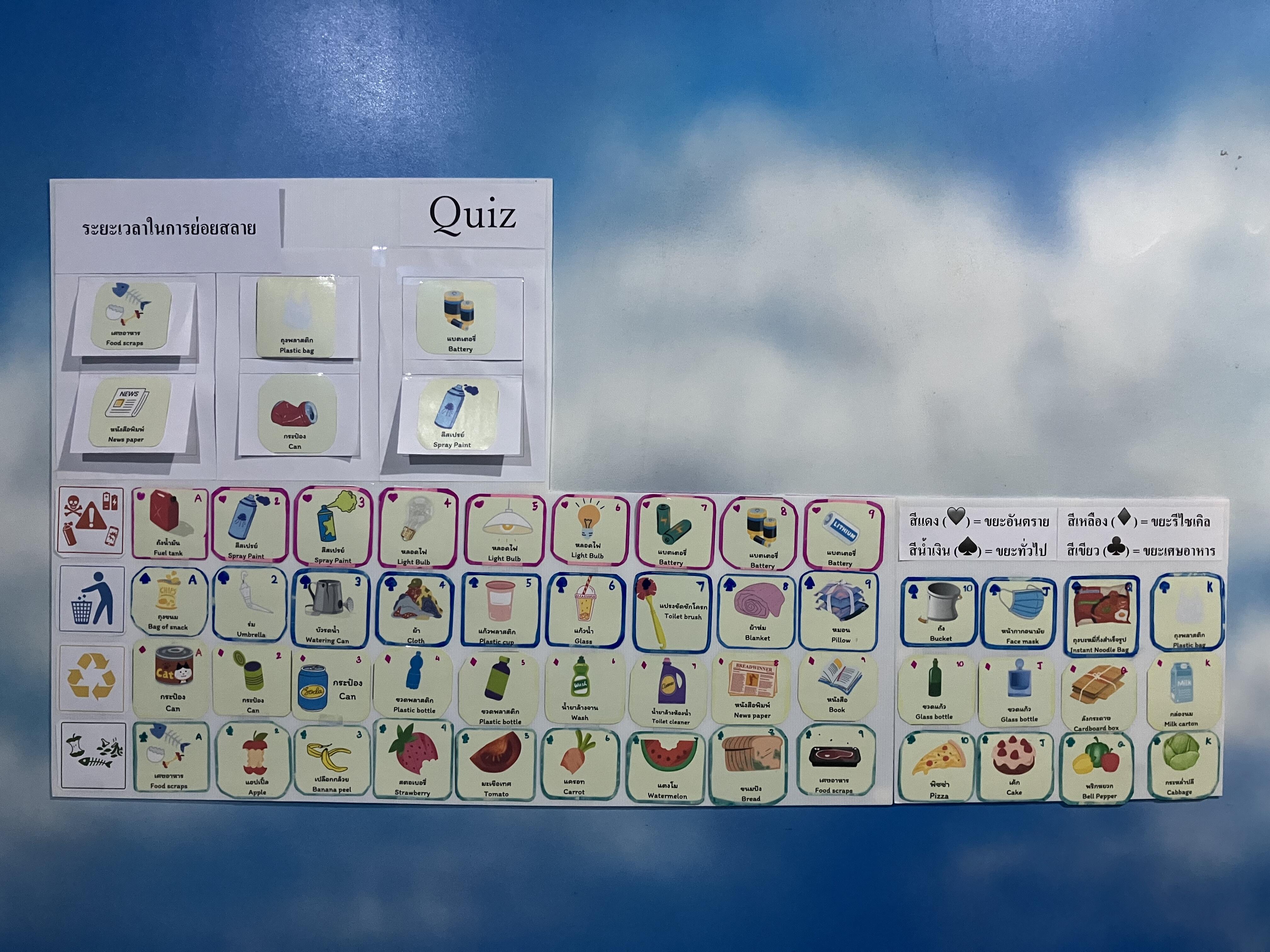 こちらで紹介したゴミ分別カードを使って、分解時間クイズとトランプ風展示を作成しました。次は環境カルタを作る予定です。