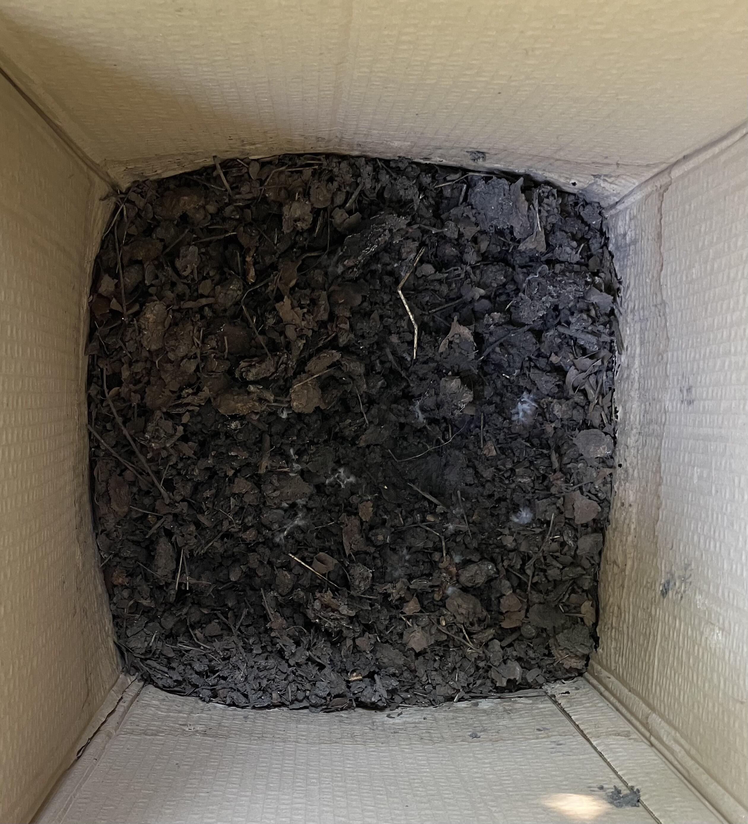 3月23日、分解床作成から約2ヶ月後には完成の目印である白い菌の繁殖が表面に見られました。(高倉式コンポスト技術)
