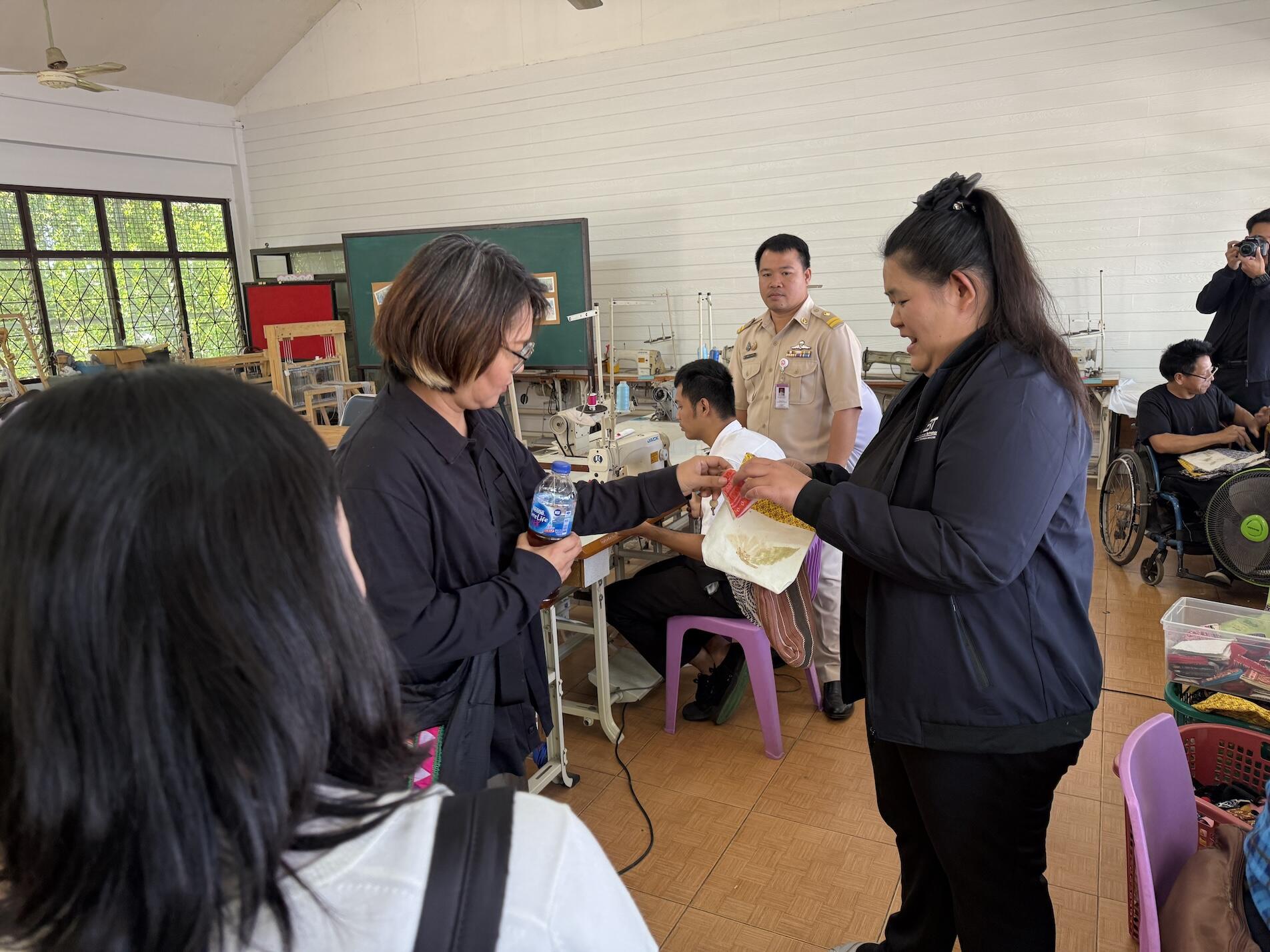 ↑ 訓練生が作ったバッグを手に取ってもらいました。このバッグ、ただのカバンではございません。