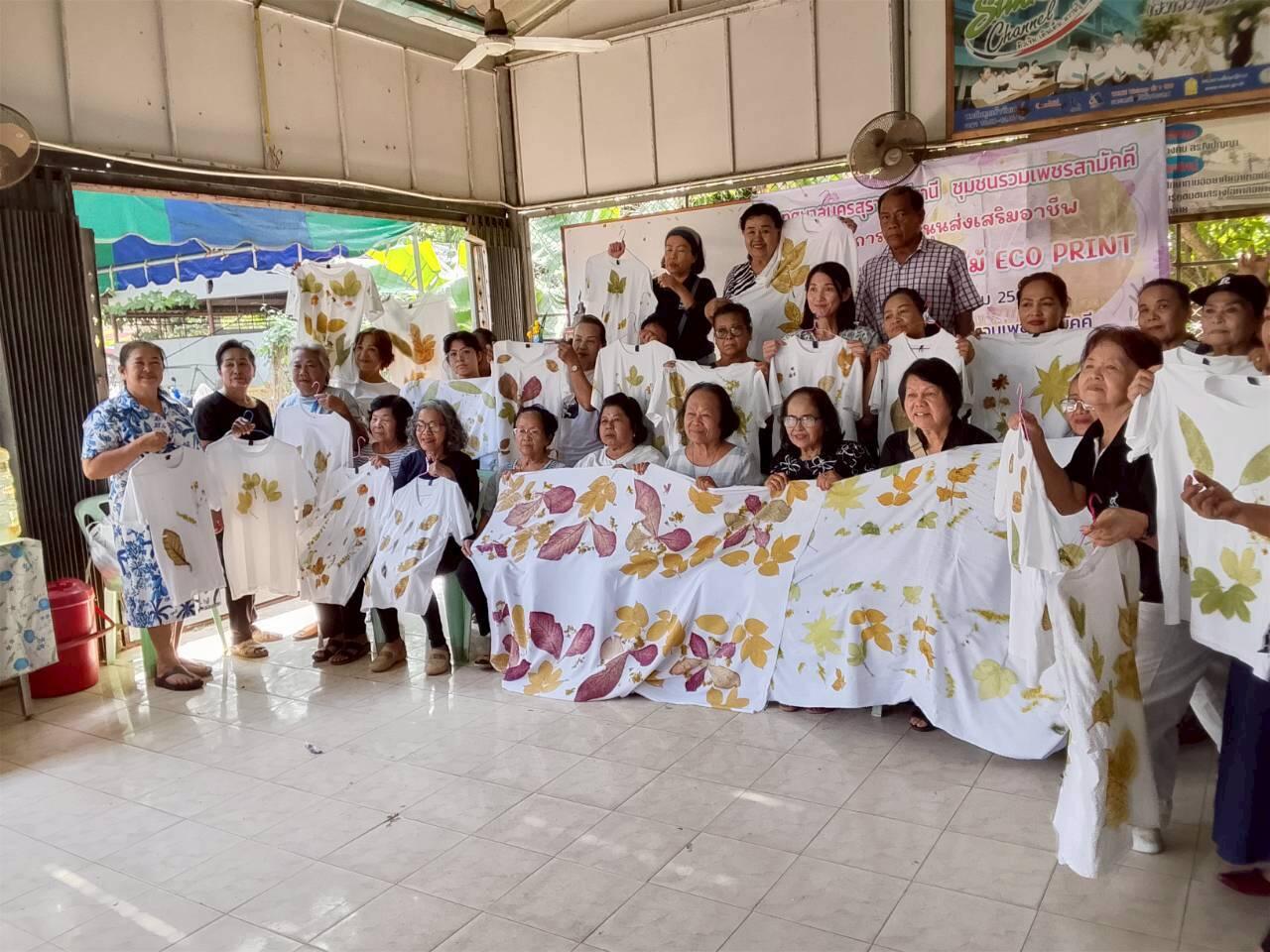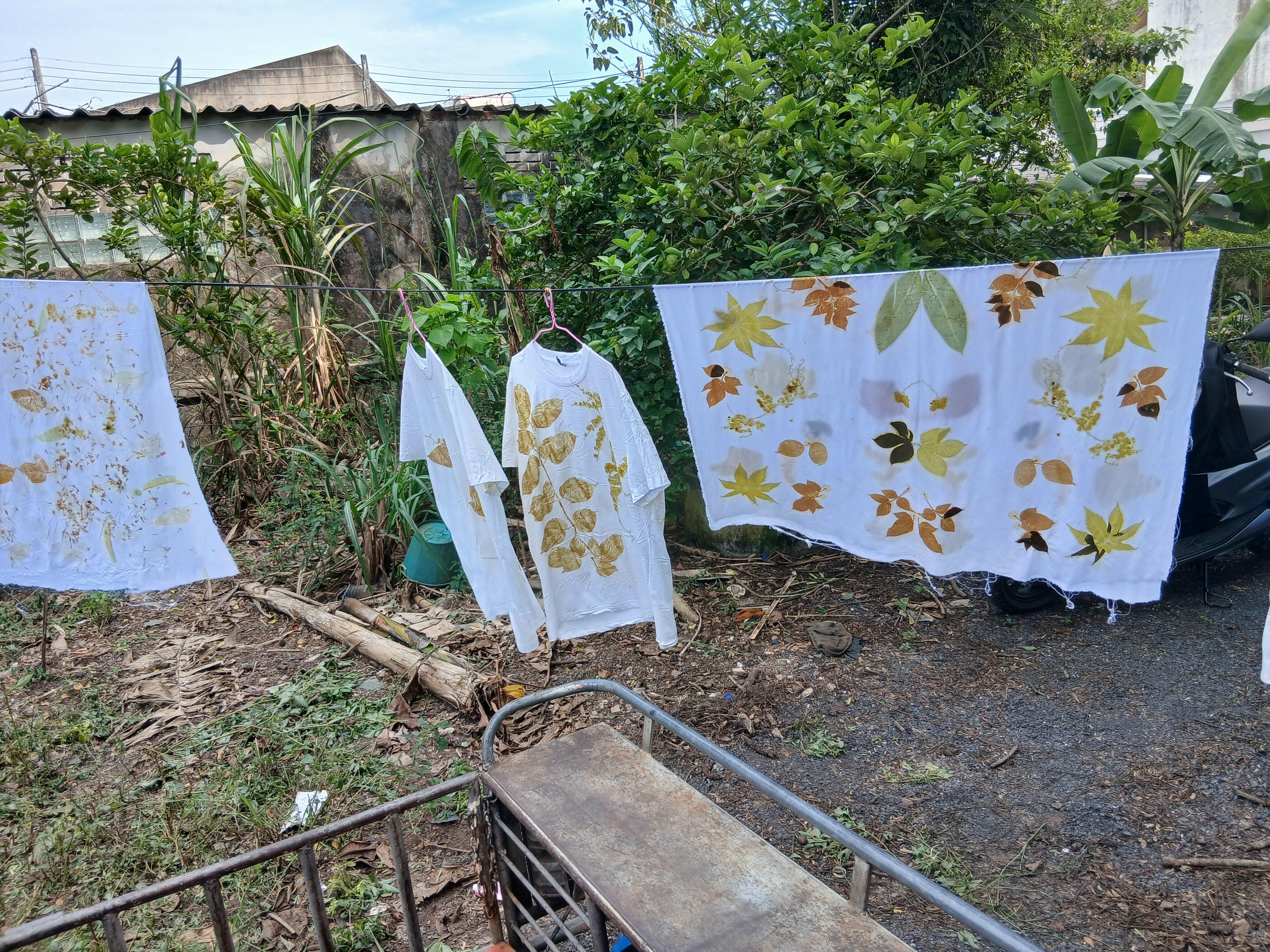 無地の白いTシャツと白い布に、様々な花や草木の模様をうつしました。専用の粉を入れた水に布を浸し、それぞれ好きな花や草木でデザインして、蒸して干したら出来上がりでした。(簡単に書きましたが、2日にかけて行われました)