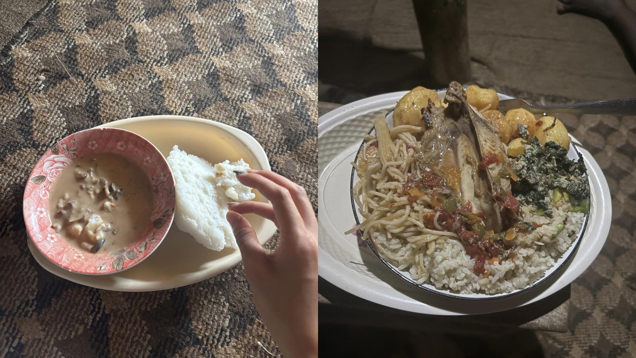 待っていたのは、この日いちばん盛りだくさんの食事でした(写真:右)。この家庭の普段の食事(写真:左)と比較するとおかずの種類や量の多さは一目瞭然です。味はどれも本当においしい。ただ、食べても食べても減らないお皿を前に、フードファイターになった気分でした。