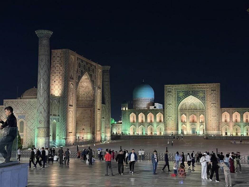 サマルカンドブルーと呼ばれる青色のタイルを並べて装飾した建造物が美しく、市内に点在するモスクや霊廟には昼夜問わず多くの観光客が足を運んでいます。
