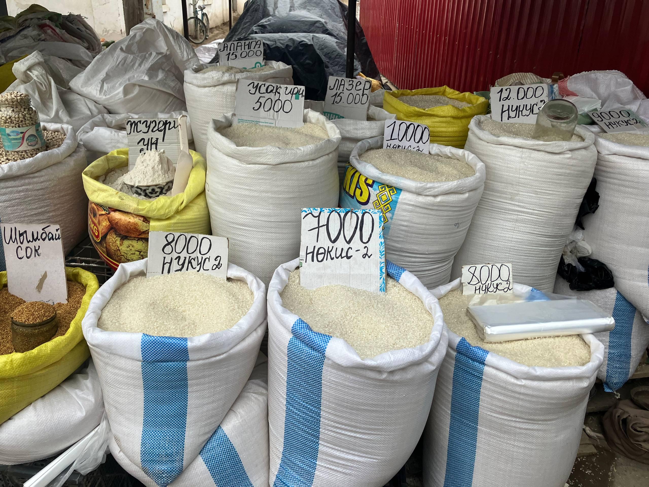 バザールのお米売り場。НykycまたはHokucがヌクス米です。