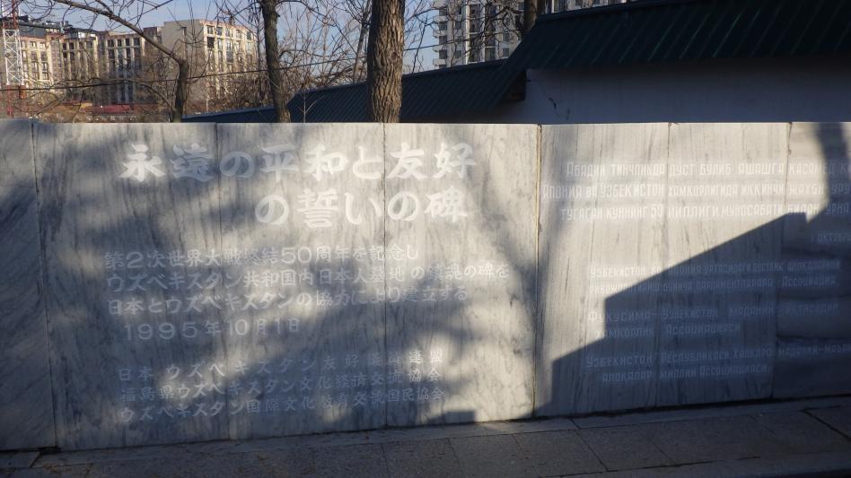 帰国後、日ソ戦争に興味を持った私は、関連書籍を探し回っていたのですが、個人的に 好きな作家である浅田次郎氏が、「終わらざる夏」という、千島列島最北端で行われた日 ソ間戦争を題材にした小説を書いていることを知り、購入してみました。本作品を読んで いる途中、度々、前述の寿司パーティーのことを思い出しつつ、もし自分がこの登場人物 であったらどう行動するだろうと考えました。何だか、これまで虚構とも現実とも覚束な かった、先の戦争というものが、寿司パーティーの一件以来、急に現実味を帯びながら、 自身に迫ってきたような気がするのです。 タシケントに再び戻って来た先日、約二年ぶりに、市内にある日本人墓地を訪れてみま した。シベリア抑留の折、旧日本兵の方々が捕虜にされ、強制労働に従事させられた史実 は皆さん御存知の事と思いますが、ここタシケントにおいても、多くの日本人捕虜が強制 労働を強いられ、その中で多くの命が亡くなりました。市内にはその方々の慰霊を祀った 石碑と墓地があり、現地の方が今でも管理をしてくれています。私と同郷の方も数名埋葬 されており、自身の故郷にはウズベキスタンと文化交流事業を行う団体も設立されていま す。