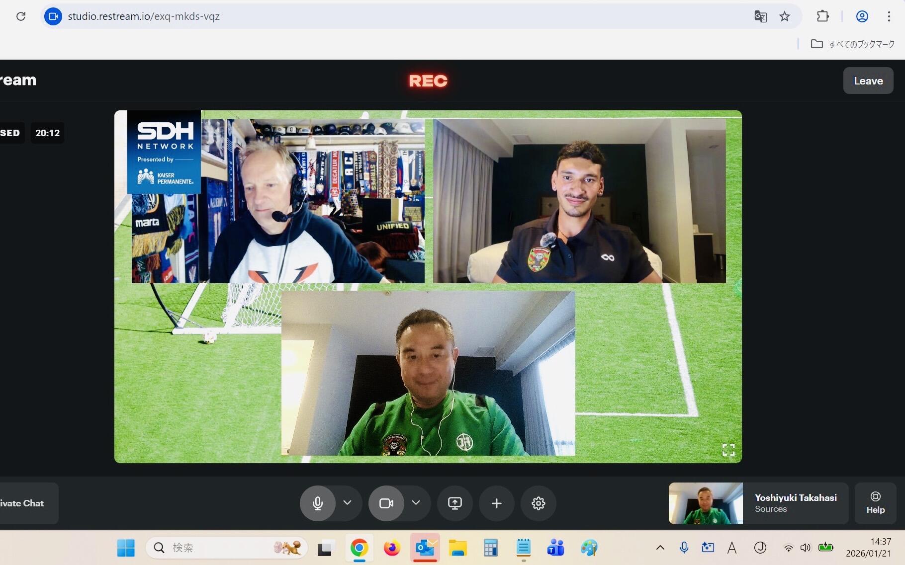 オンラインでの取材もありました。アメリカ出身の助っ人選手が活躍した直後には、さっそく本国アメリカからテレビ取材依頼が入り、オンラインで対応することに。ところが、始まる直前、選手がユニフォームを着ていなかったため、取りに戻ってしまいました。彼を待つ10分ほど私一人で、ホストの早口な質問に対応するなど、場をつなぐのが大変でした(汗)。以下はその様子です。