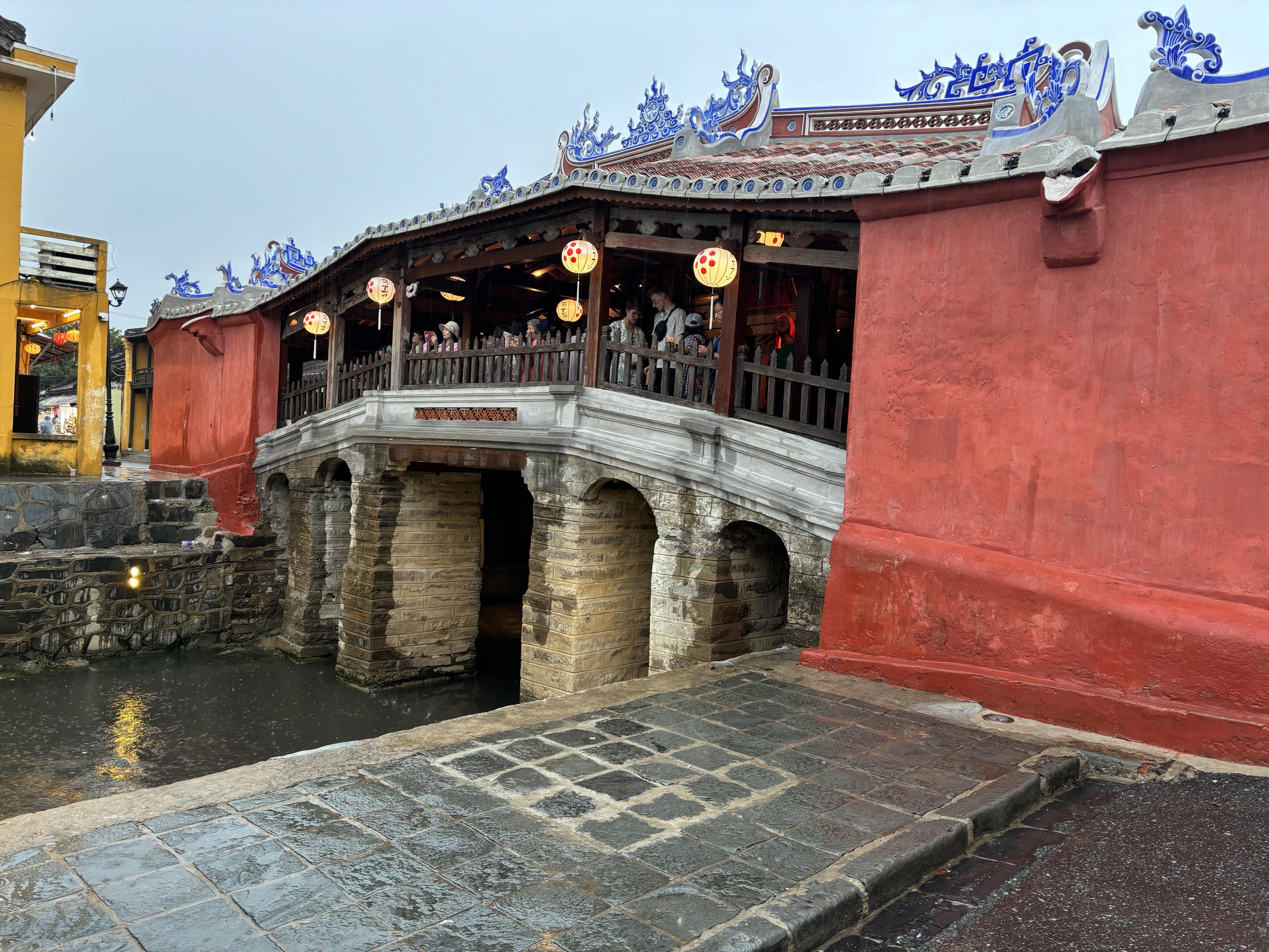 1593年頃、日本人商人によって初めの形が建設され、ホイアンの繁栄と国際交流を象徴する橋として機能しました。橋の全長は約18 m、幅約3 mで、構造は「上家下橋」と呼ばれる屋根付き構造で、橋の上に寺院が建つ独特なデザインをしています。東側のチャンフー通り(旧中国人街エリア)と西側のグエンティミンカイ通り(旧日本人街エリア)を結んでいます。