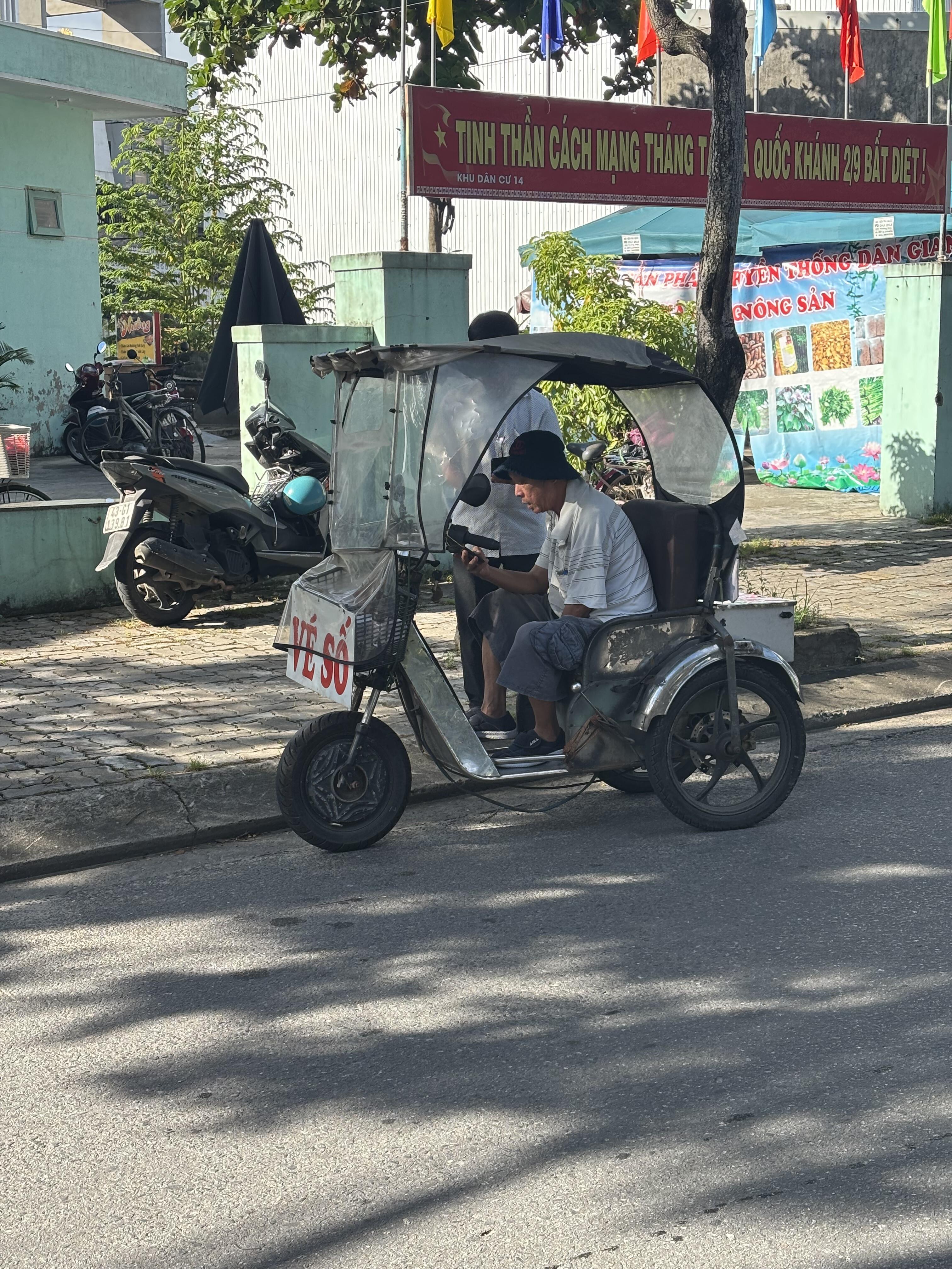 (写真:このような乗り物で宝くじを売る人も街中で見かけます)